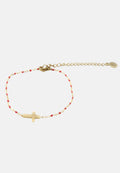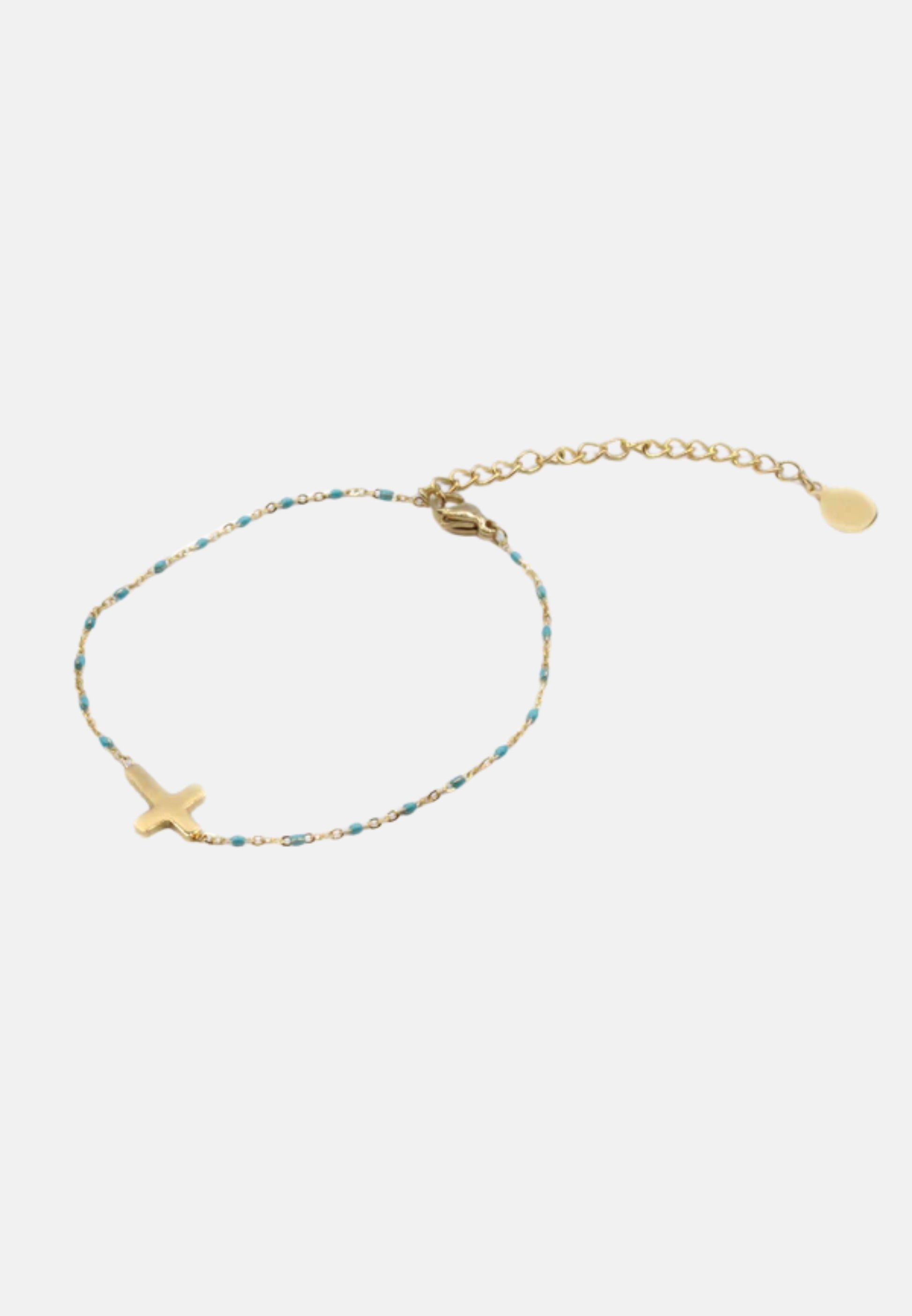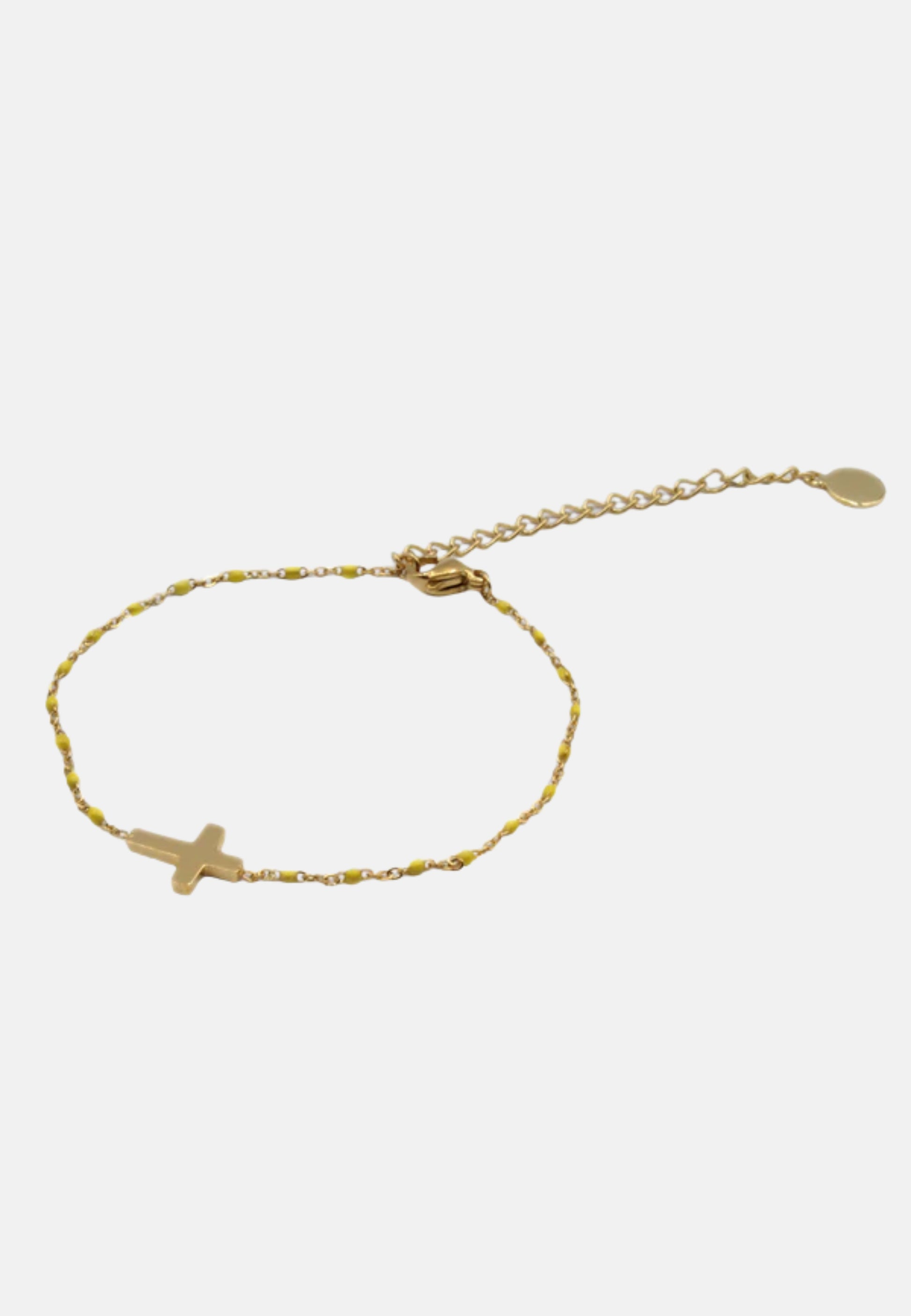 Bracciale con croce sia per uomo che per donna, braccialetto con croce in oro e con perline colorate in rosso, giallo o azzurro. Il bracciale si adatta a qualsiasi tipo dipolso, il bracciale misura 21CM, può essere regolato dai 17CM ai 20CM. Questo è un bracciale portafortuna ideale da regalo.