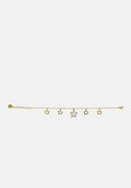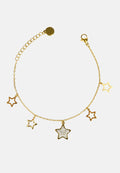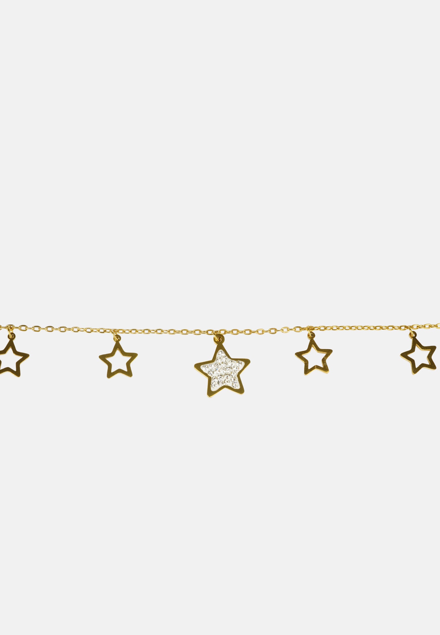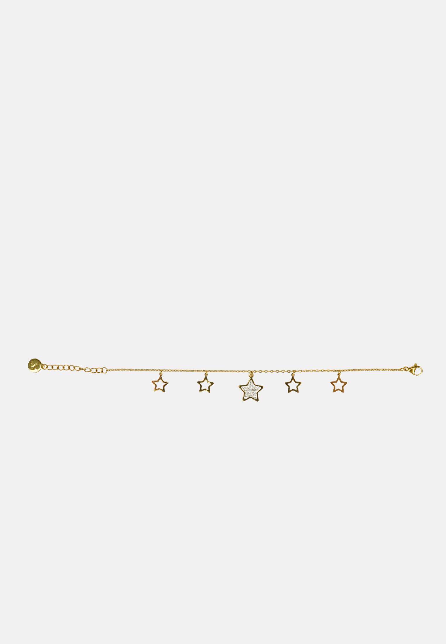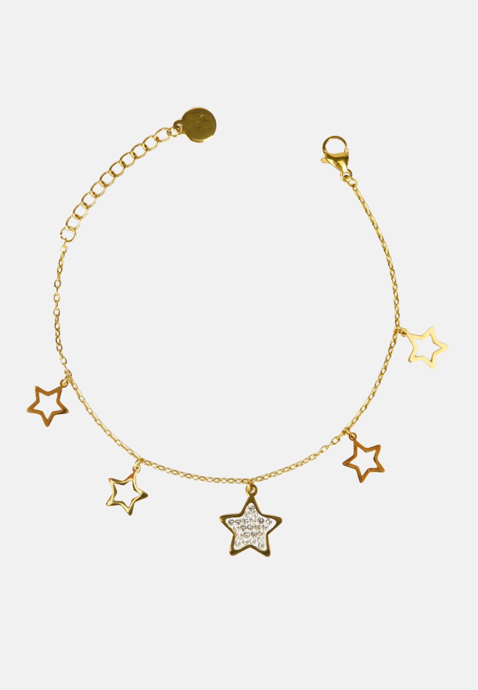 Il braccialetto presenta cinque charm a forma di stella, che aggiungono un tocco di luminosità e un'atmosfera incantevole. Le stelle sono tutte dello stesso design, ma quella al centro è leggermente più grande delle altre, questa stella centrale è anche particolarmente speciale perché è adornata da strass brillanti all'interno, che catturano la luce e creano un effetto scintillante. La colorazione del bracciale è disponibile in due varianti: oro e argento. La versione oro presenta una finitura dorata luccicante, che dona un aspetto caldo e prezioso al bracciale. La versione argento, invece, ha una finitura argentea brillante, che conferisce un'eleganza classica e raffinata. Per quanto riguarda la misura, il bracciale è regolabile per adattarsi perfettamente a diverse dimensioni del polso. La sua lunghezza varia da 17 a 20 cm e consente di regolare la misura in base alle preferenze personali e al comfort.