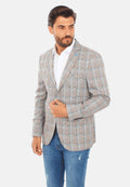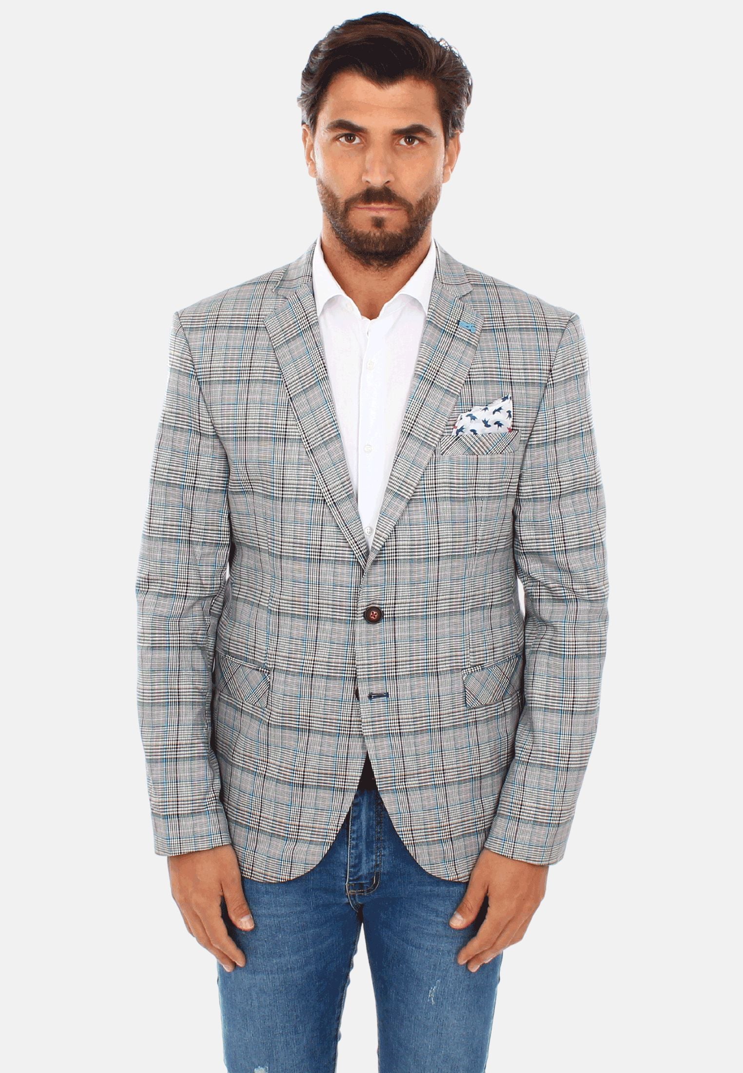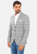 Giacca da uomo primaverile estiva con fantasia a quadri colorata su base grigia. Blazer leggero con chiusura a due bottoni, tasche in vita e taschino al petto, due taschini interni. Arricchita con spilla sul colletto che raffigura una moto e pochette da taschino a fantasia. Modello sfoderato realizzato in 62% polyestere, 34% viscosa e 4% lycra. Vestibilità slim fit, il modello indossa una taglia 52 ed è alto 189 cm. Rifiniture sartoriali, ideale per uno stile classico o sportivo.