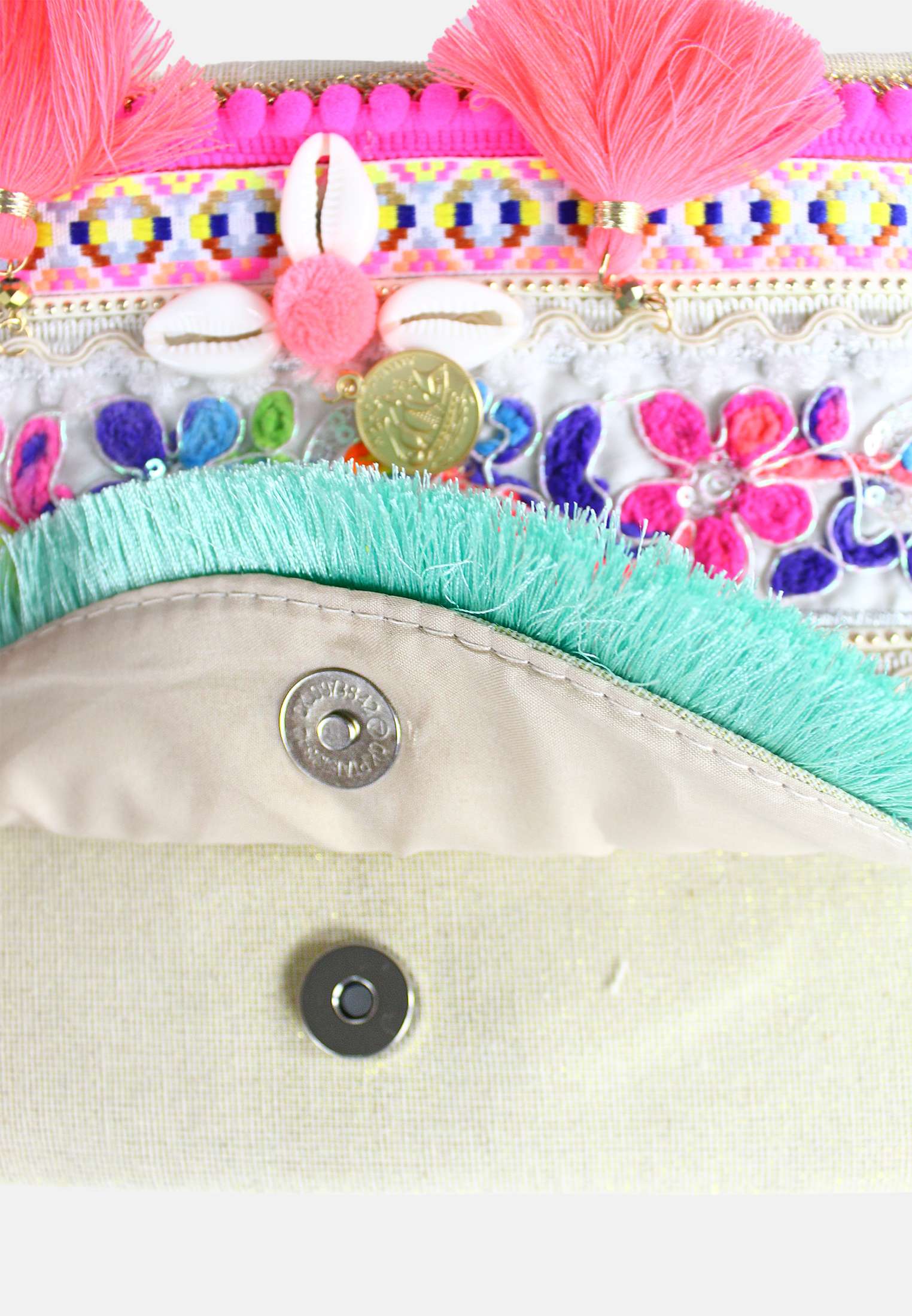 Questa borsa a mano da mare è il perfetto accessorio per completare il tuo look boho-chic. Realizzata con cura e attenzione ai dettagli, la pochette è realizzata in resistente cotone e lino, perfetta per resistere alle avventure estive. La fantasia hippie aggiunge un tocco di colore e vivacità, trasmettendo un'atmosfera allegra e spensierata. La dimensione compatta della borsetta la rende ideale per portare con te l'essenziale durante le tue giornate al mare. Puoi facilmente riporre il tuo telefono, portafoglio, chiavi e altri piccoli oggetti all'interno, tenendoli al sicuro grazie alla chiusura con clip.