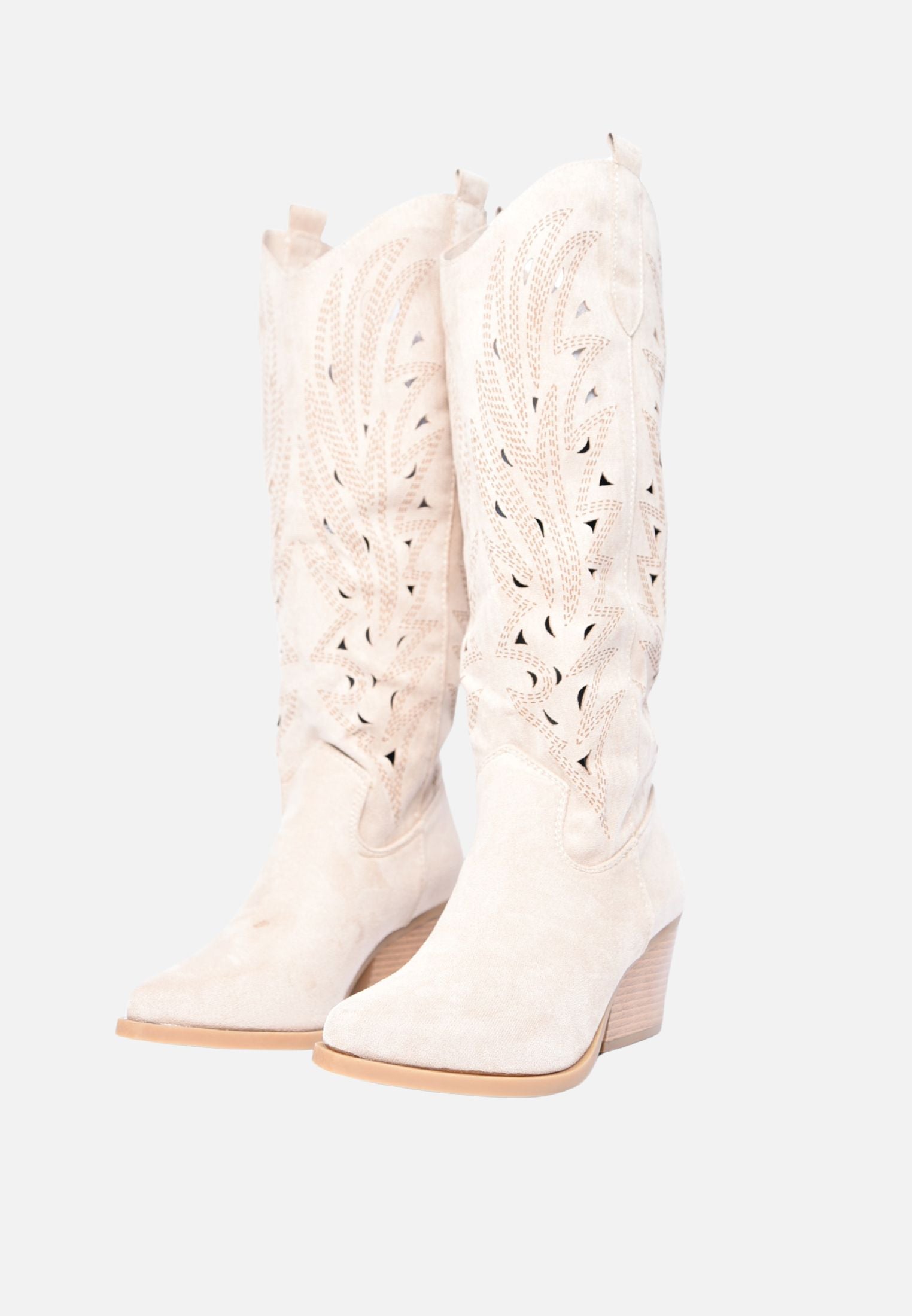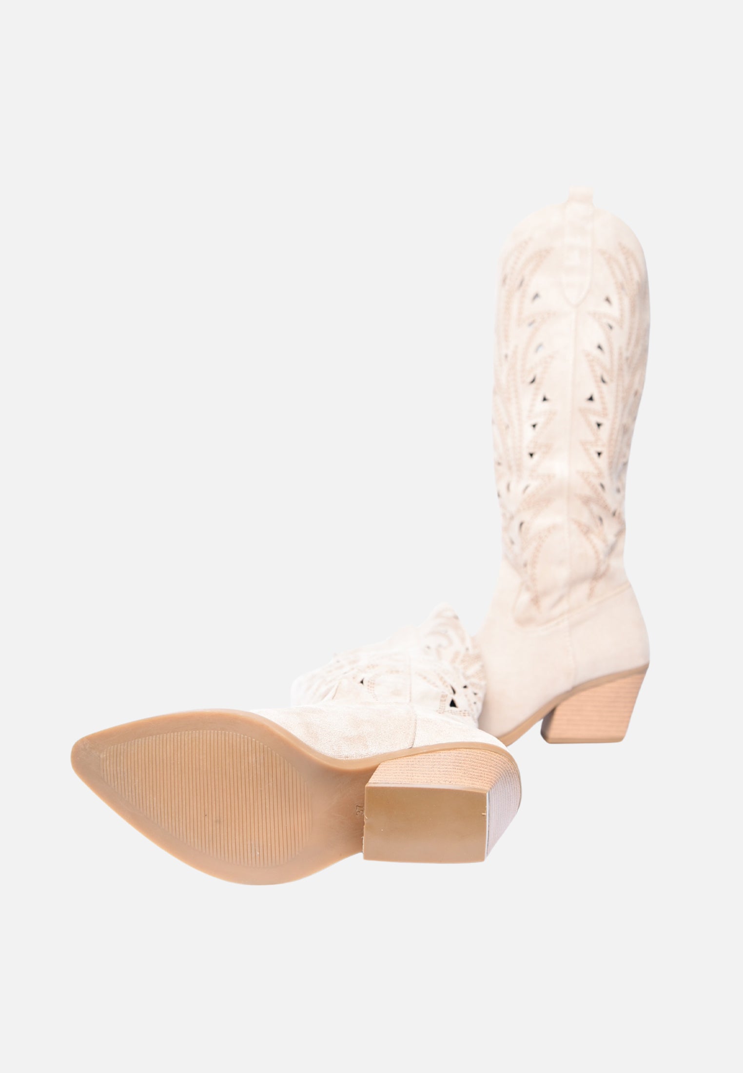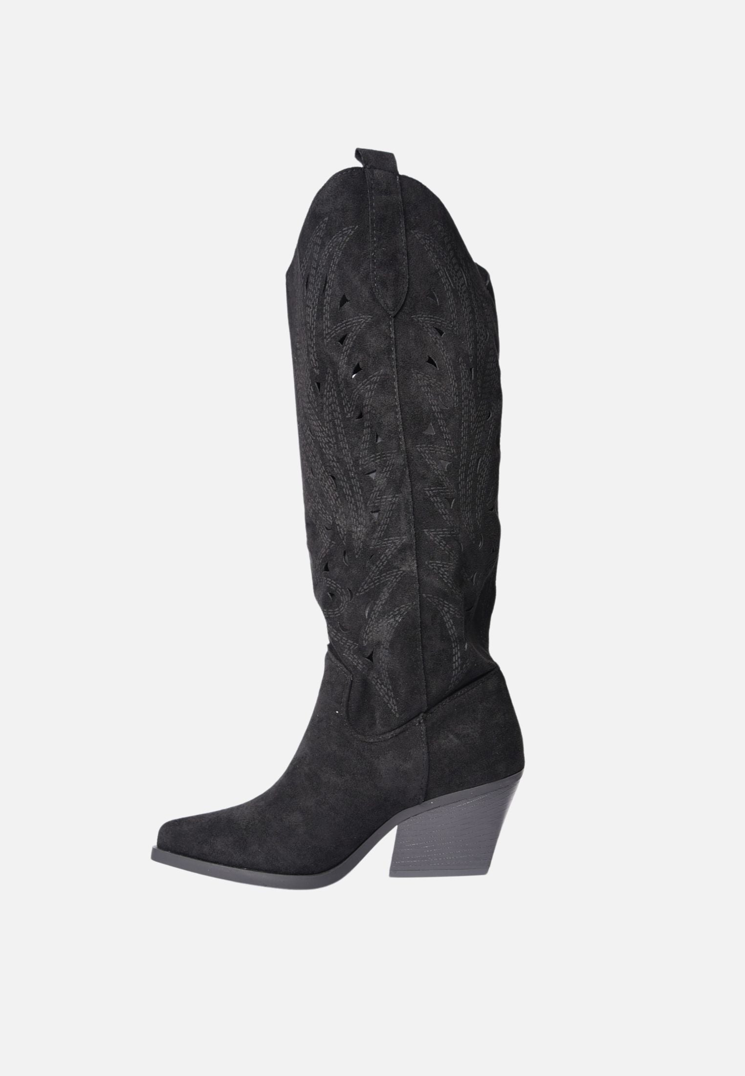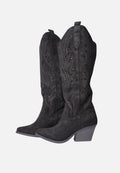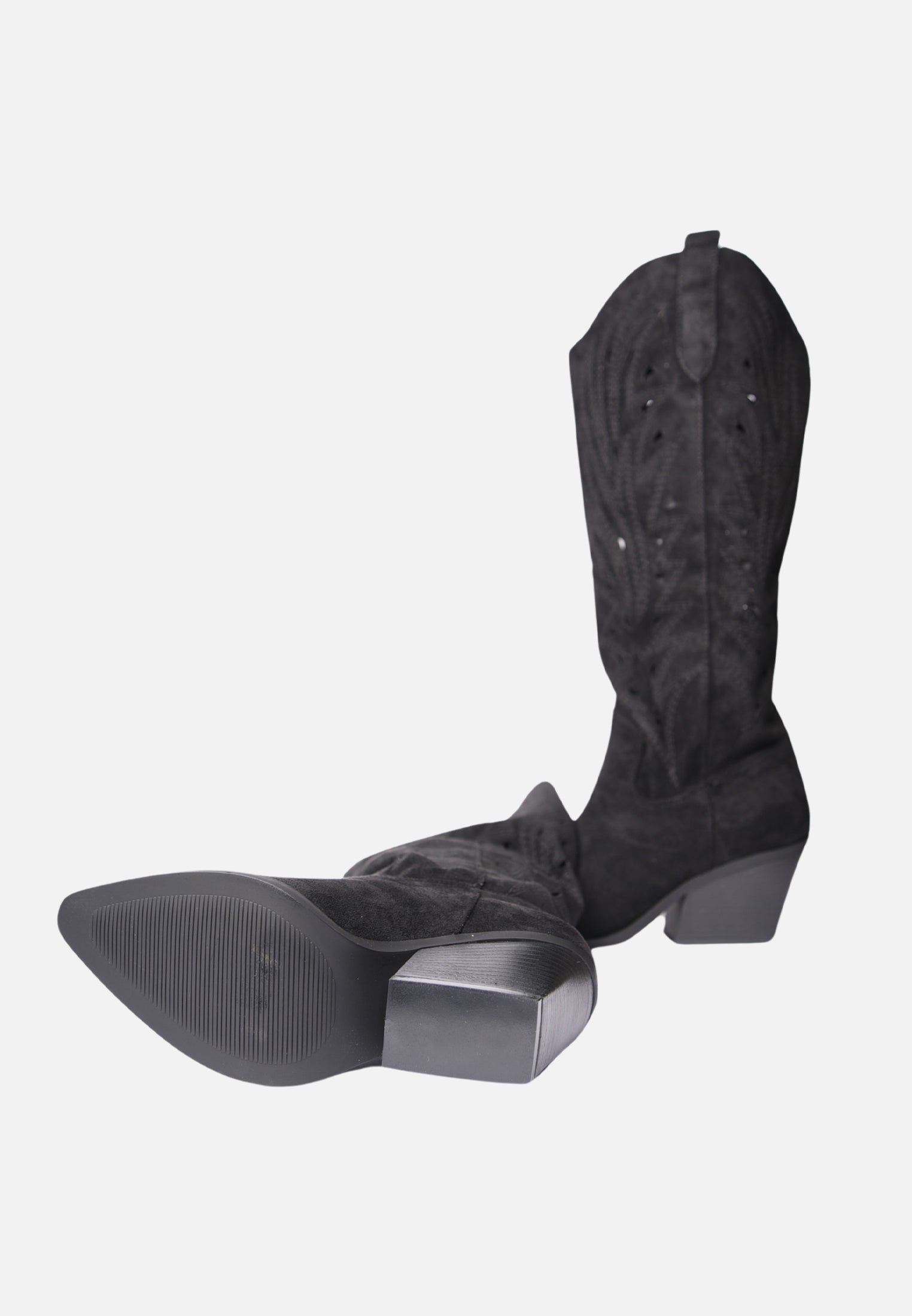 Découvrez l'élégance audacieuse du style West avec nos bottes de cowboy pour femmes, en éco-suède. Ces camperos emblématiques, conçus avec un bout effilé et un talon bloc effet bois de 6,5 cm, incarnent l'essence du style cowboy avec une touche moderne. La structure sans fermeture à enfiler garantit un ajustement rapide et facile, idéal pour la femme dynamique qui ne veut pas renoncer au style au quotidien. Avec une tige de 39 cm de haut, ces bottes affinent la silhouette et se marient parfaitement avec des jeans et des robes, offrant une polyvalence inégalée pour toutes les occasions. La semelle en caoutchouc robuste équipée d'inserts antidérapants assure stabilité et sécurité sur tous les terrains, tandis que la semelle intérieure rembourrée promet un confort durable, vous permettant de profiter de chaque pas. La tige souple et large enveloppe délicatement la jambe, assurant un ajustement optimal qui s'adapte à vous. Disponibles en noir et beige classiques, ces camperos sont le complément parfait à toute garde-robe, offrant une touche de caractère et de sophistication à vos tenues. Idéales pour les femmes de tous âges qui cherchent à exprimer leur personnalité à travers leur choix de chaussures, ces bottes de cowboy en daim sont la fusion parfaite entre mode, fonctionnalité et confort. Avec des tailles disponibles du 36 au 41 et une coupe régulière.