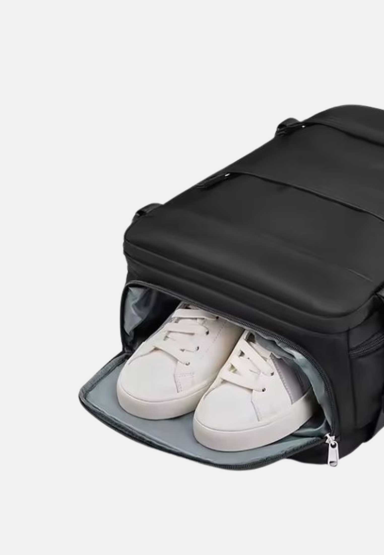 L'aspect pratique se poursuit avec un compartiment à chaussures dédié, qui vous permet de séparer les chaussures sales des vêtements propres, et un compartiment arrière rembourré supplémentaire, idéal pour transporter en toute sécurité un ordinateur portable jusqu'à 16 pouces. Sur le devant du sac à dos, deux poches zippées supplémentaires permettent de garder à portée de main des objets comme un passeport, des billets ou des collations.