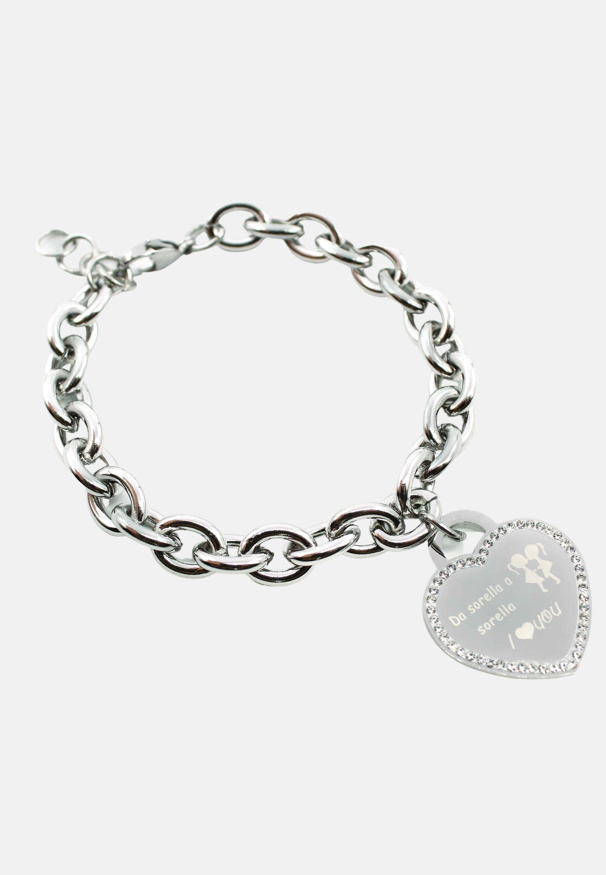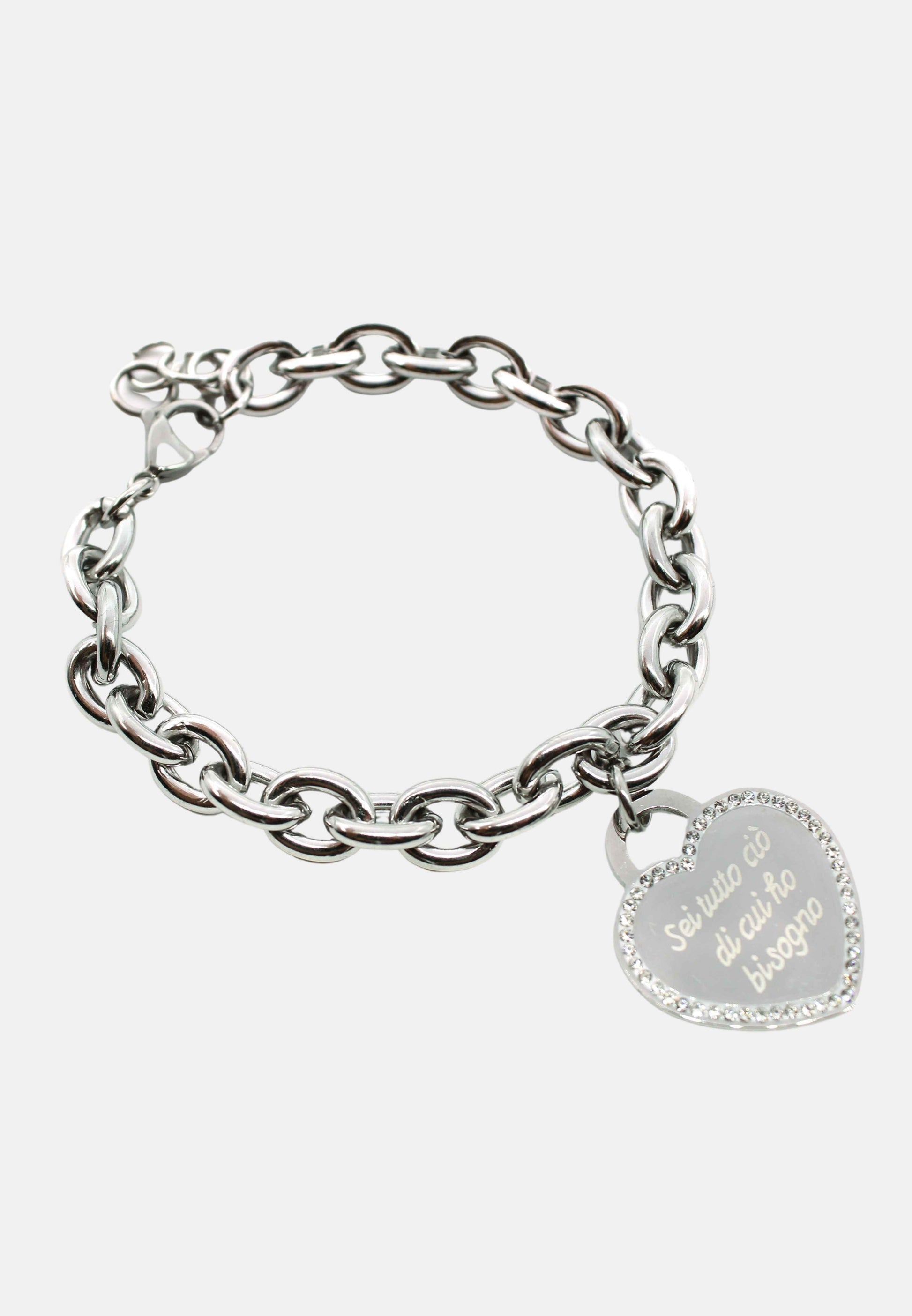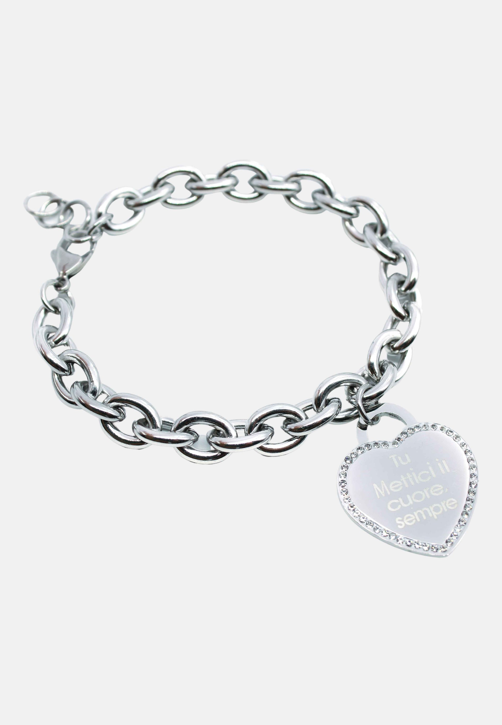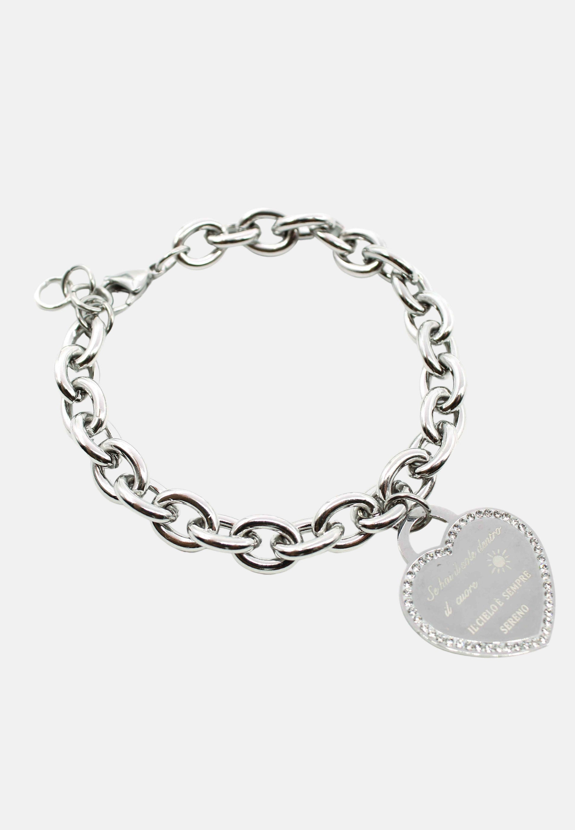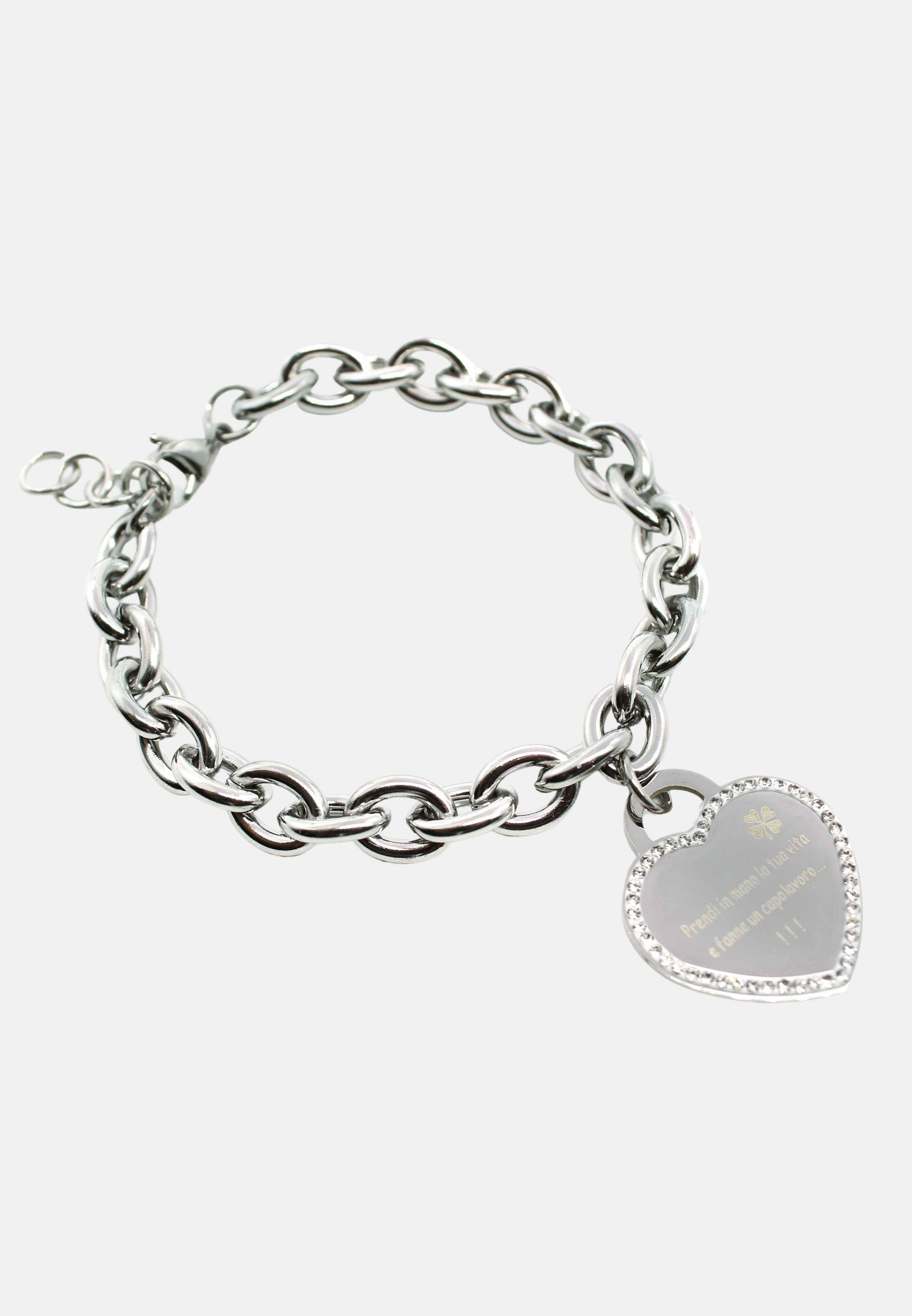 Bracciale da donna con cuore e frase incisa. Braccialetto da regalo con charms a cuore e frase incisa in acciaio. Bracciale a catena con cuore e brillantini. Bracciale ideale da regalare ad un'amica con pensieri, frasi, parole.. per anniversario compreanno nascita. Idea regalo San Valentino. Consegnato con confezione regalo. Chiusura a moschettone con estensione regolabile. Lunghezza Bracciale (da capo a coda) 21 cm (inclusa estensione). Grandezza cuore 3x3 cm