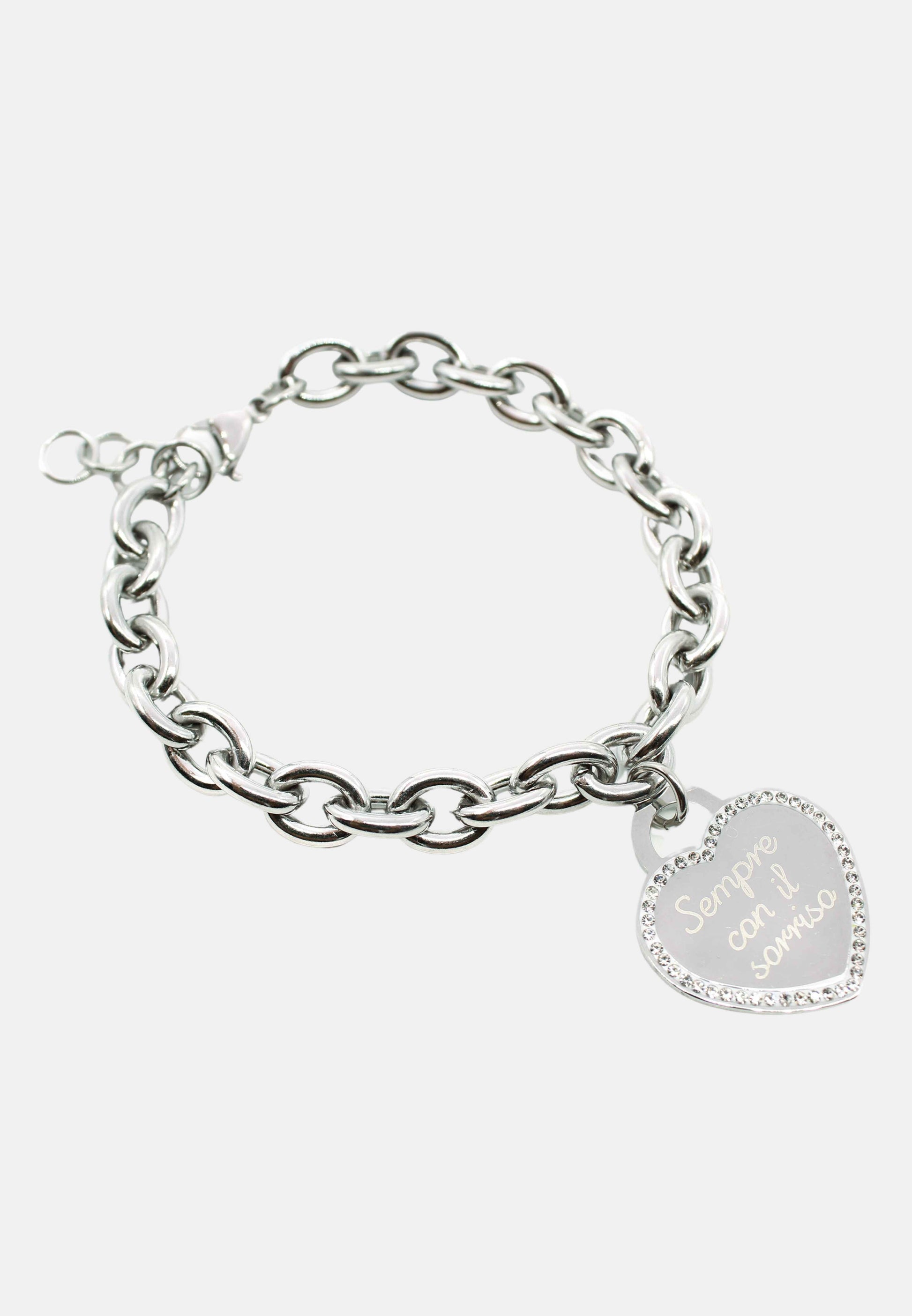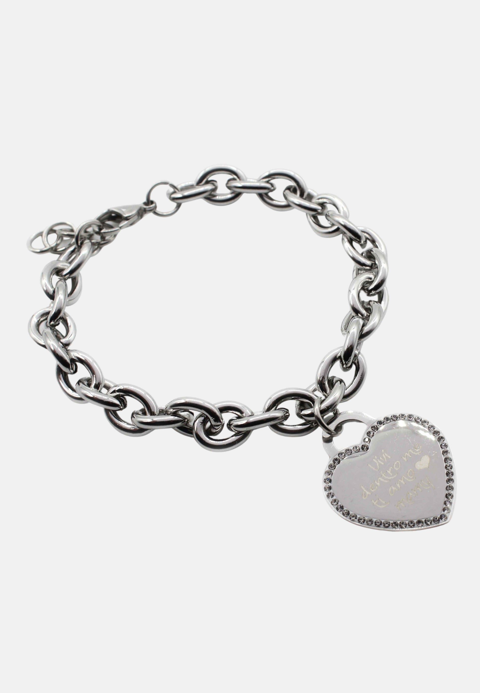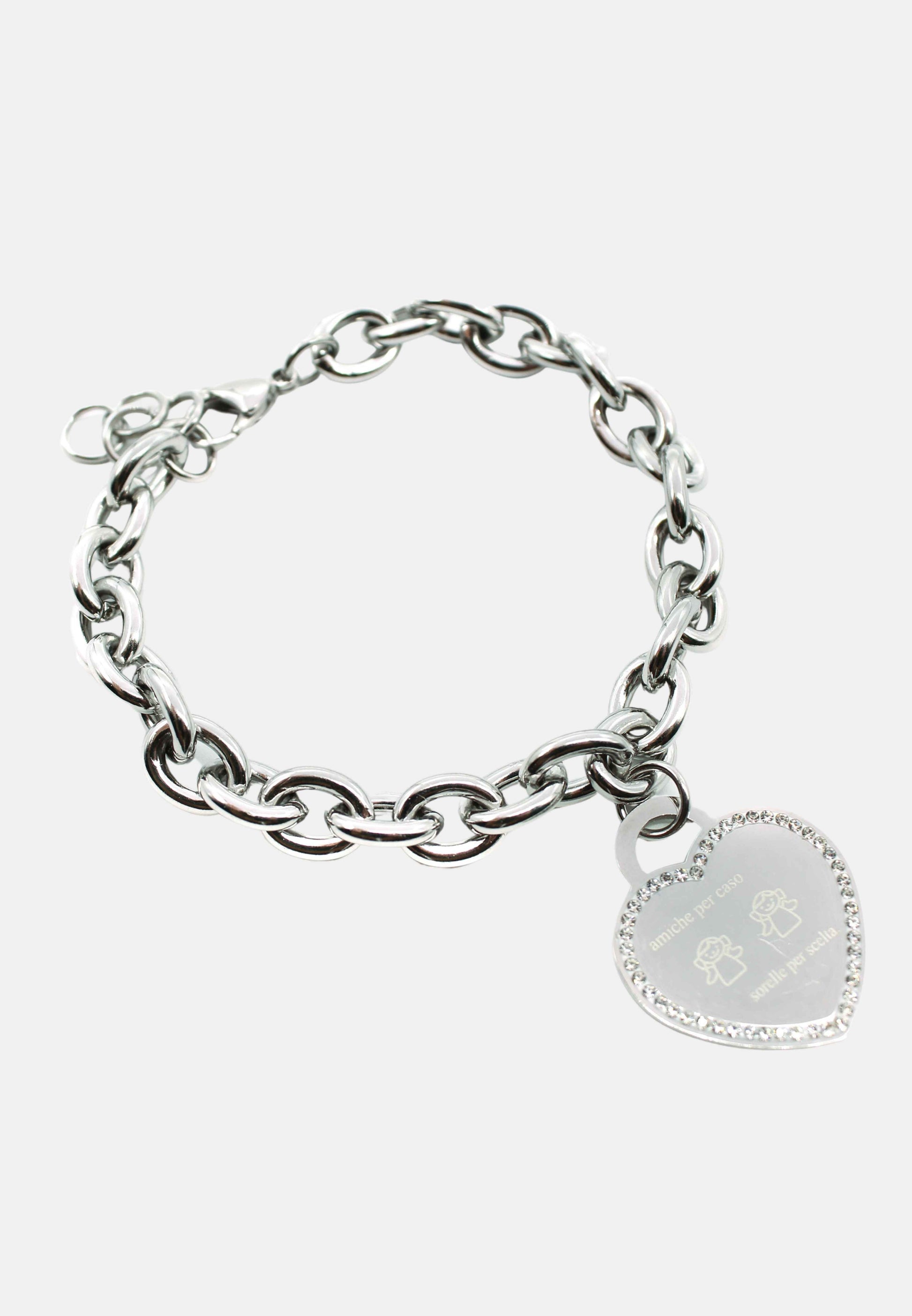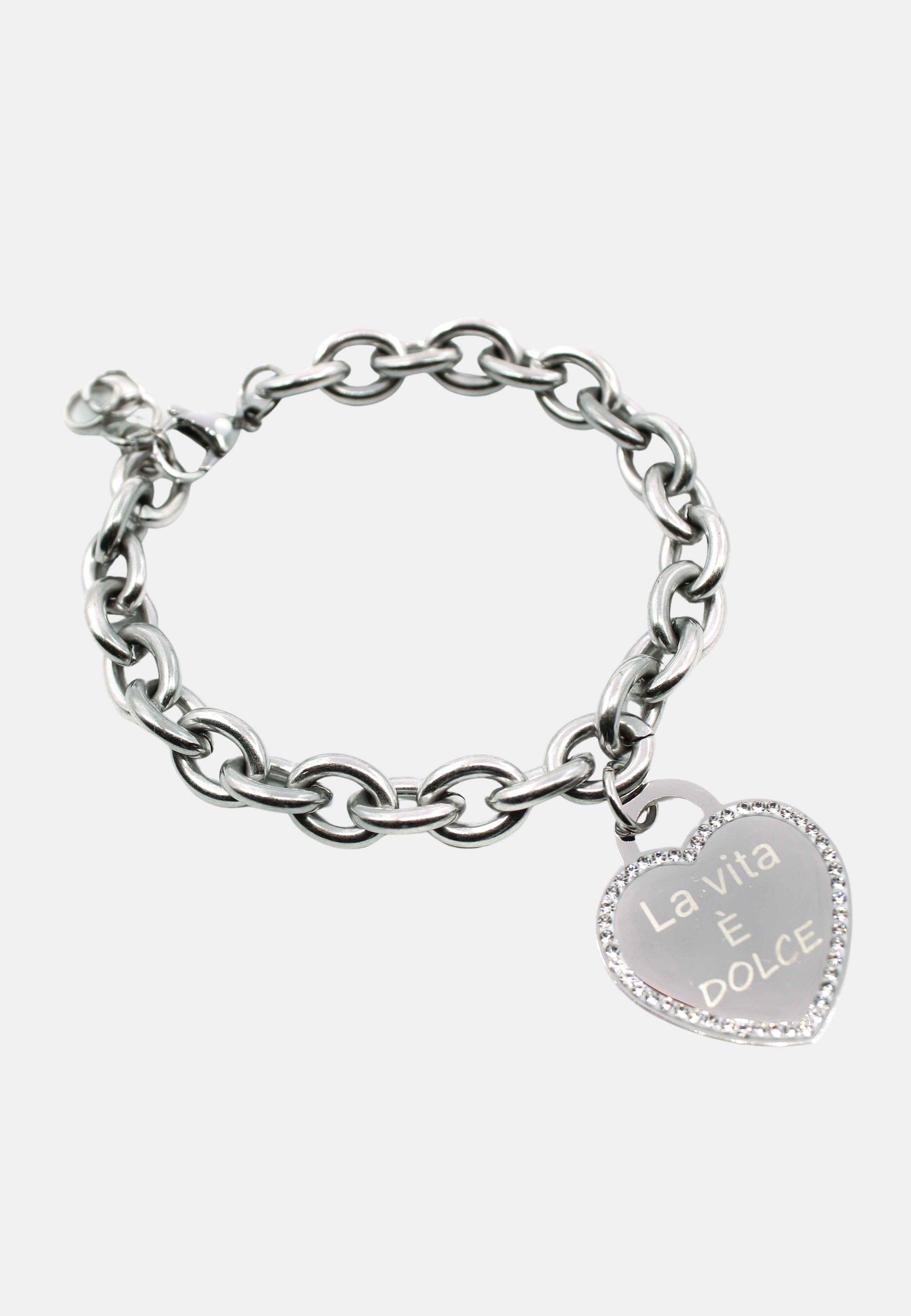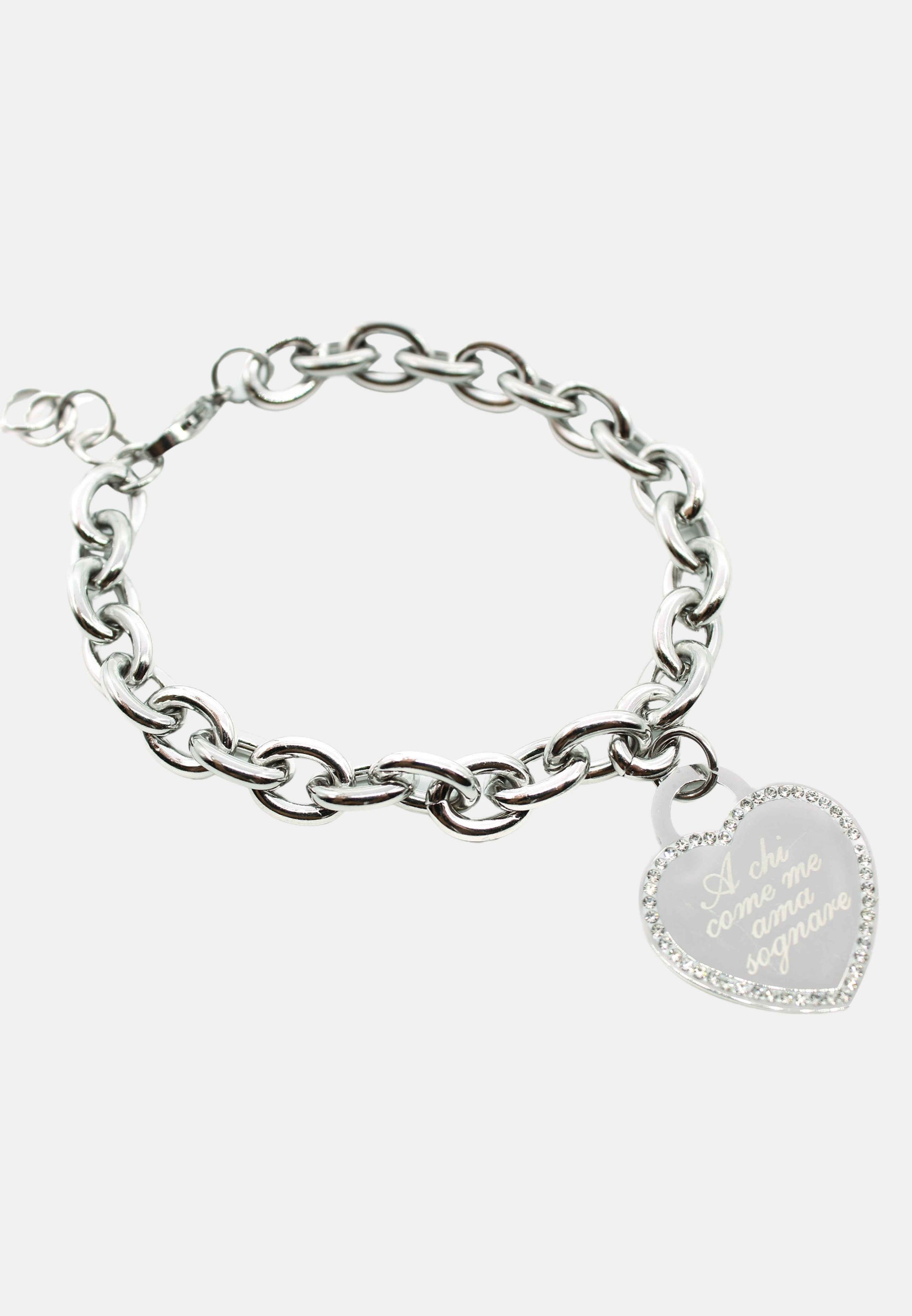 Bracciale da donna con cuore e frase incisa. Braccialetto da regalo con charms a cuore e frase incisa in acciaio. Bracciale a catena con cuore e brillantini. Bracciale ideale da regalare ad un'amica con pensieri, frasi, parole.. per anniversario compreanno nascita. Idea regalo San Valentino. Consegnato con confezione regalo. Chiusura a moschettone con estensione regolabile. Lunghezza Bracciale (da capo a coda) 21 cm (inclusa estensione). Grandezza cuore 3x3 cm