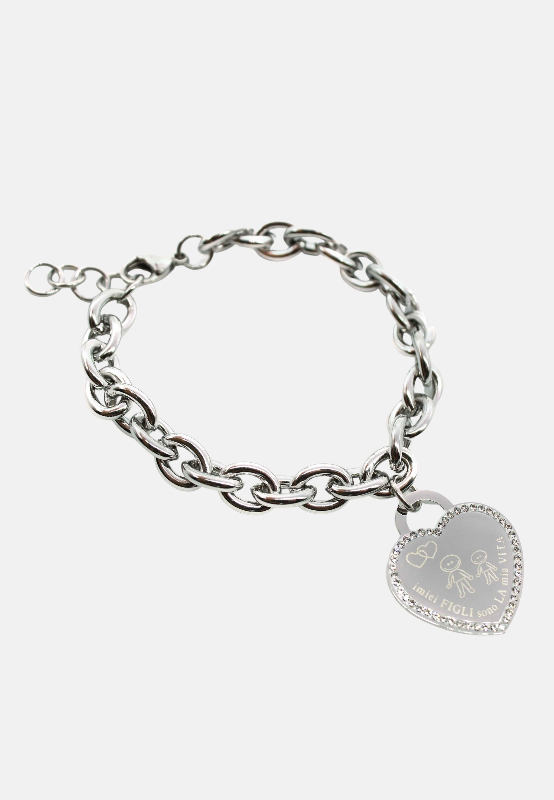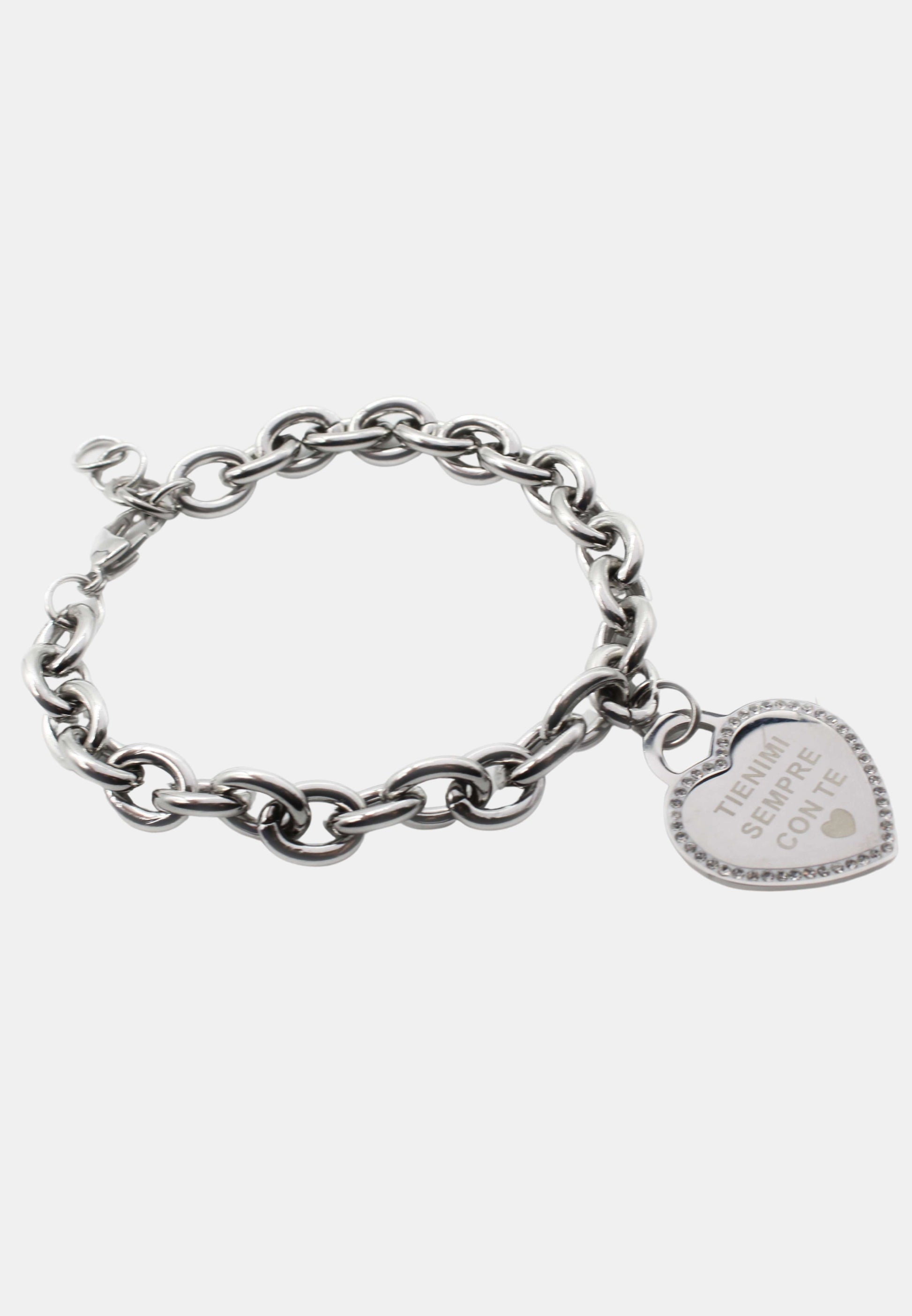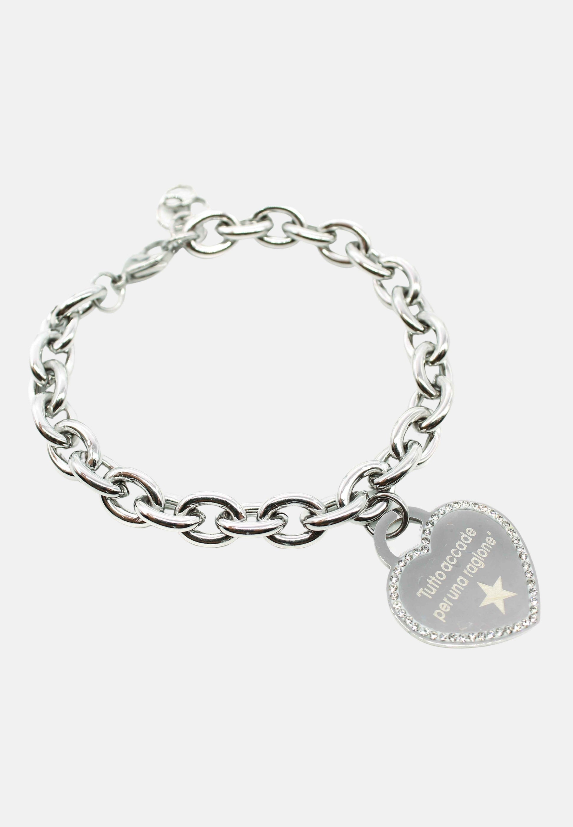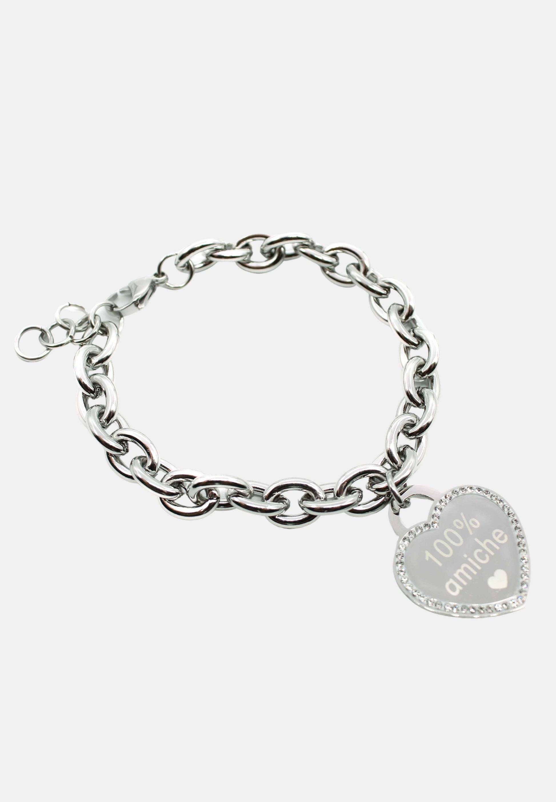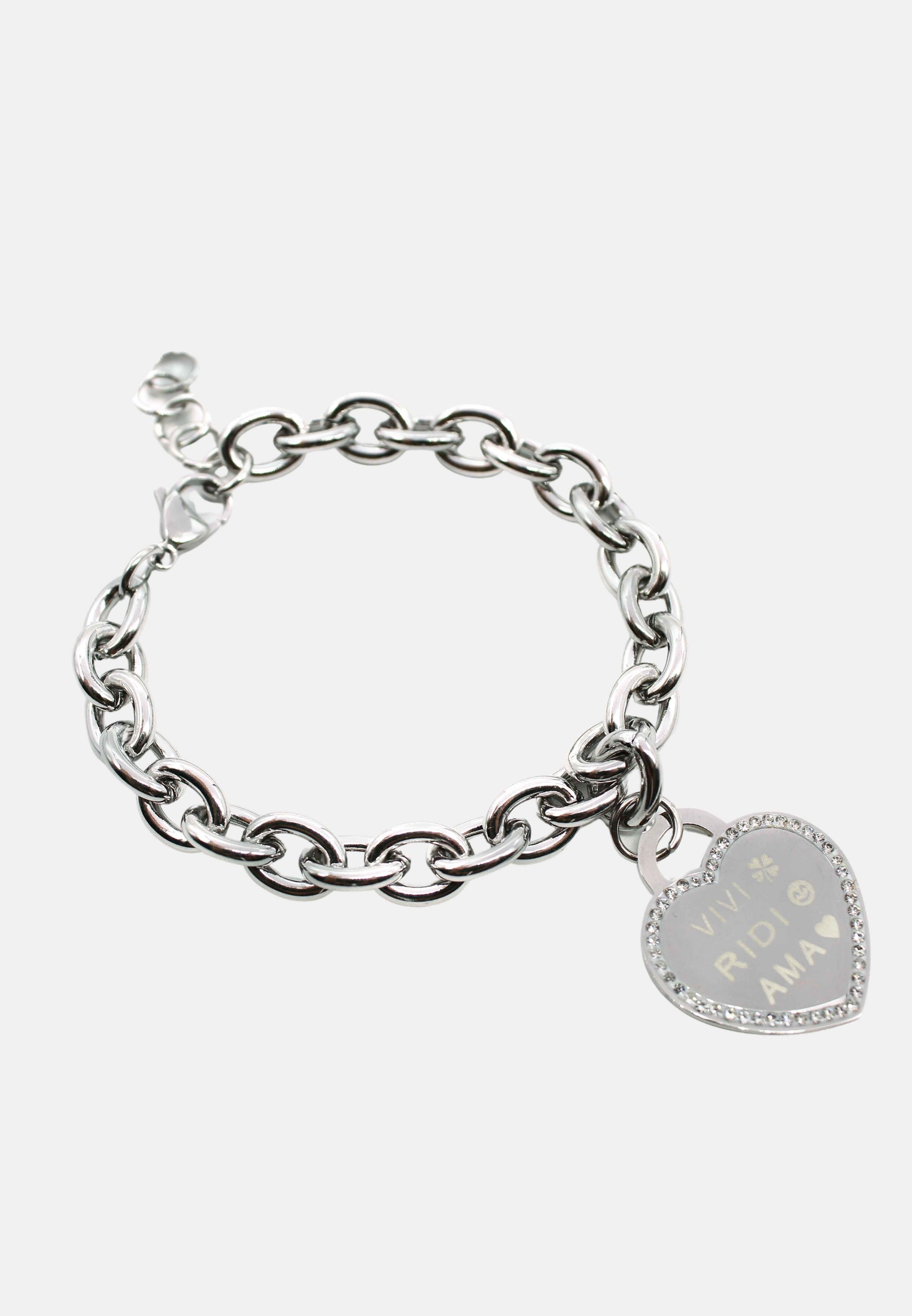 Bracciale da donna con cuore e frase incisa. Braccialetto da regalo con charms a cuore e frase incisa in acciaio. Bracciale a catena con cuore e brillantini. Bracciale ideale da regalare ad un'amica con pensieri, frasi, parole.. per anniversario compreanno nascita. Idea regalo San Valentino. Consegnato con confezione regalo. Chiusura a moschettone con estensione regolabile. Lunghezza Bracciale (da capo a coda) 21 cm (inclusa estensione). Grandezza cuore 3x3 cm