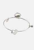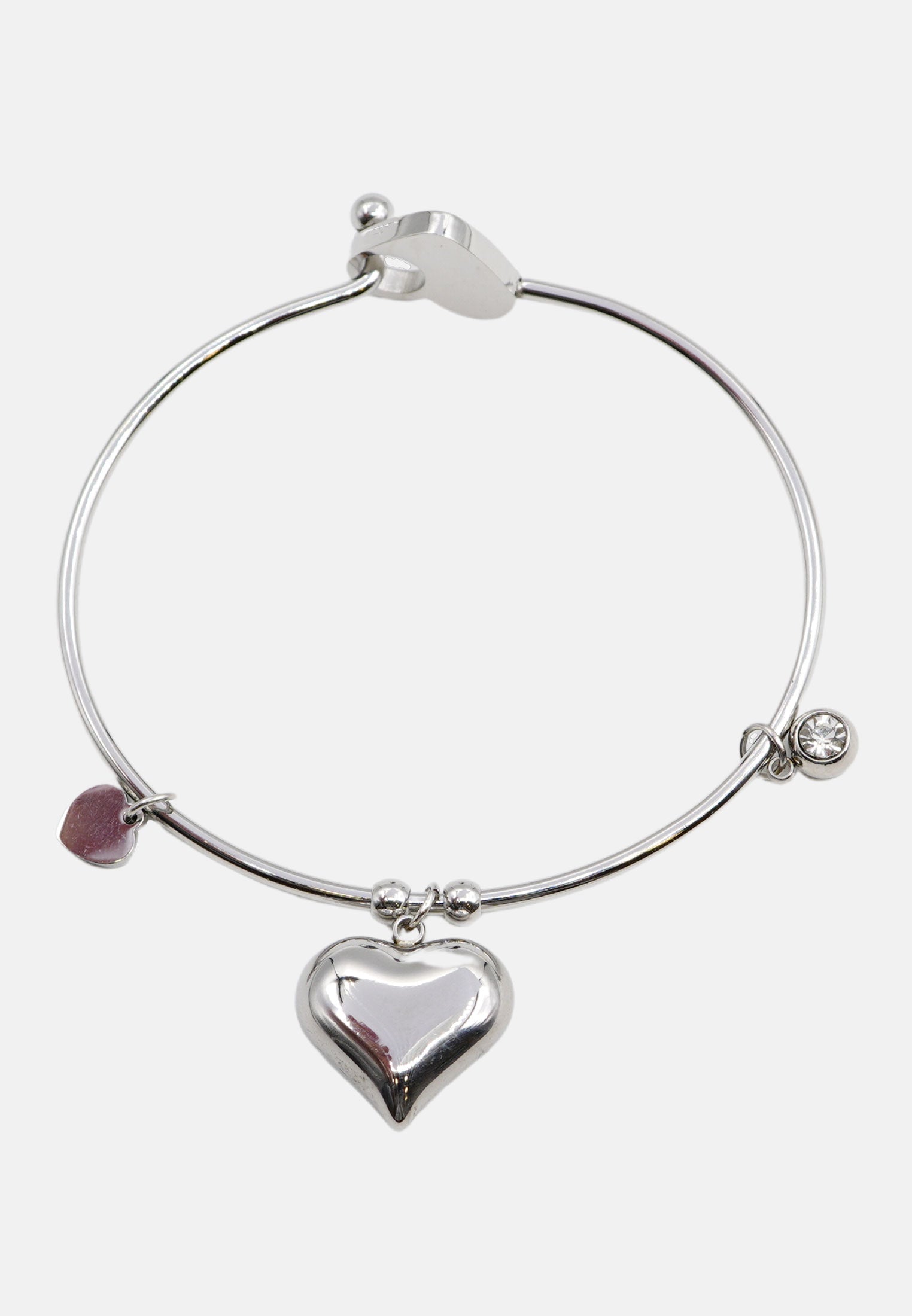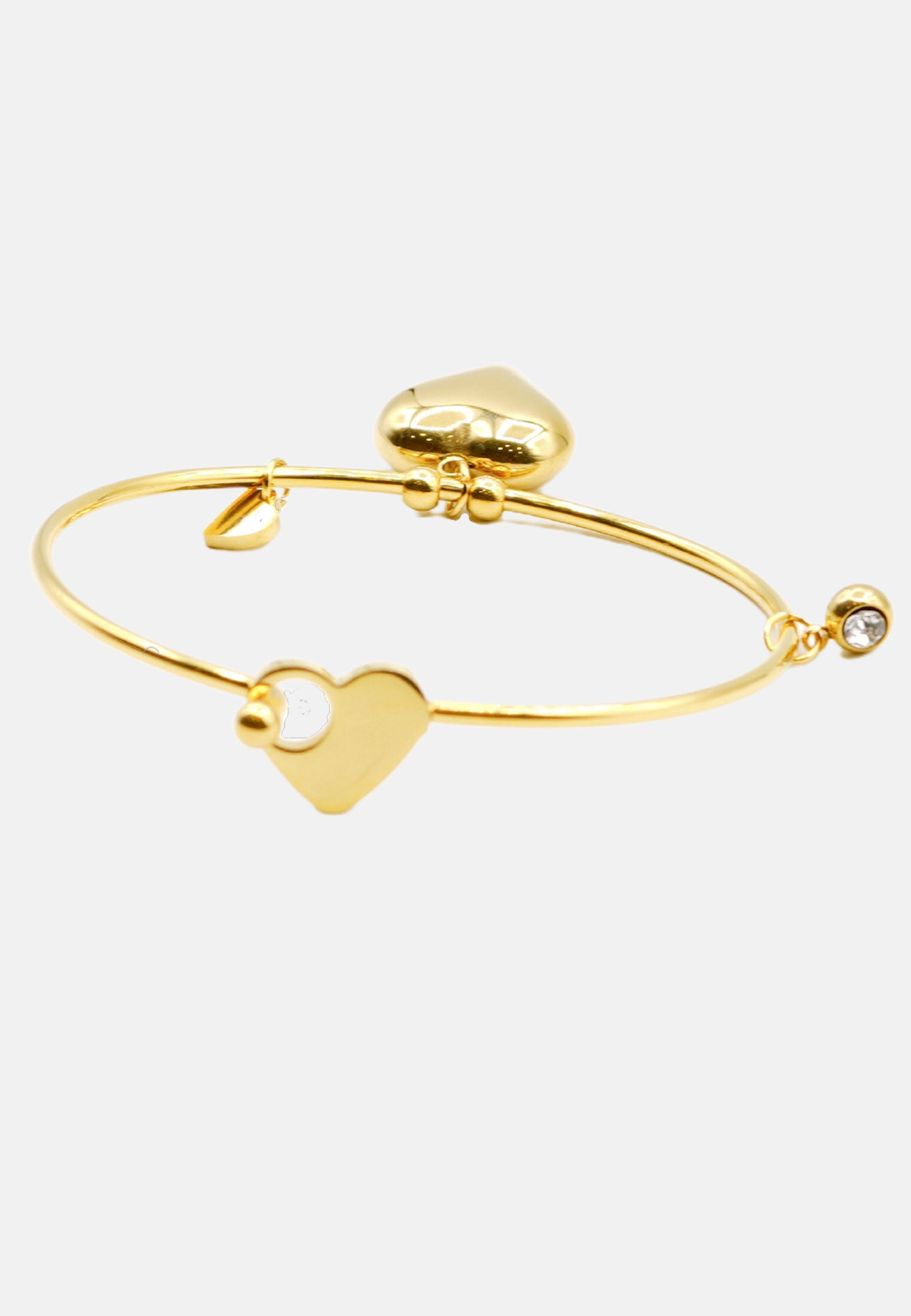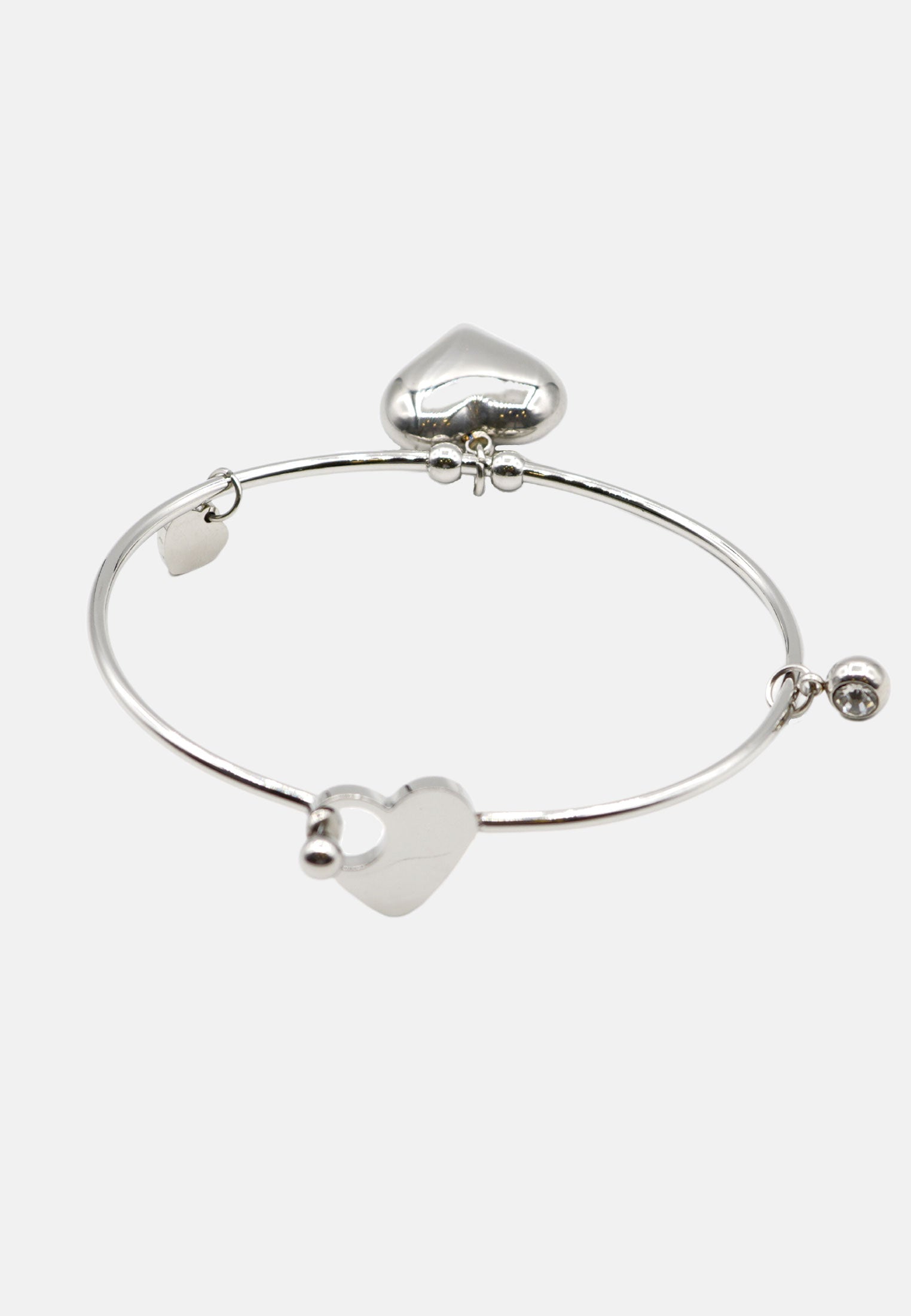 Bracciale donna rigido con ciondolo pendente a forma di cuore. Braccialetto con chiusura a forma di cuore con gancio. Il bracciale ha 3 ciondoli : cuore grande, cuoricino e brillantino. Diametro bracciale 6,5 cm , grandezza cuore 2 cm. Una perfetta Idea regalo adatto ad ogni donna ,con charm pendenti. Disponibile in 2 varianti di colore: oro e argento . Raffinato ed elegante il bracciale con cuore, modello bangle è l'accessorio più richiesto da ogni ragazza. Realizzato in Acciaio steel, non contiene Nickel . Una perfetta idea regalo adatta a tutte le donne, da regalare alla fidanzata, moglie o mamma o ad un'amica. Il bracciale sarà consegnato in una scatolina. Per prenderti cura al meglio del tuo bracciale e preservarne l'integrità, ti ivitiamo ad evitare l'uso di profumi direttamente a contatto col gioiello e l'immersione prolungata in acqua.