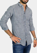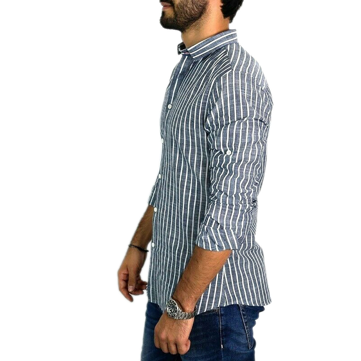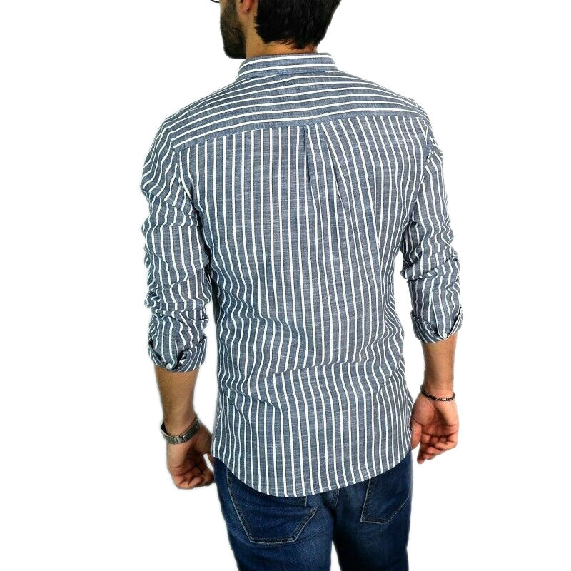 Camicia uomo in cotone a righe bianche e blu, chiusura centrale con bottoni. Camicia sportiva con collo classico, tessuto in cotone. Camicia leggera e fresca, blu e bianca da uomo dalla vestibilità slim fit è il complemento perfetto di un look formale o da cerimonia. Sotto giacca con collo classico cosi come i polsini con chiusura a bottoni.