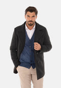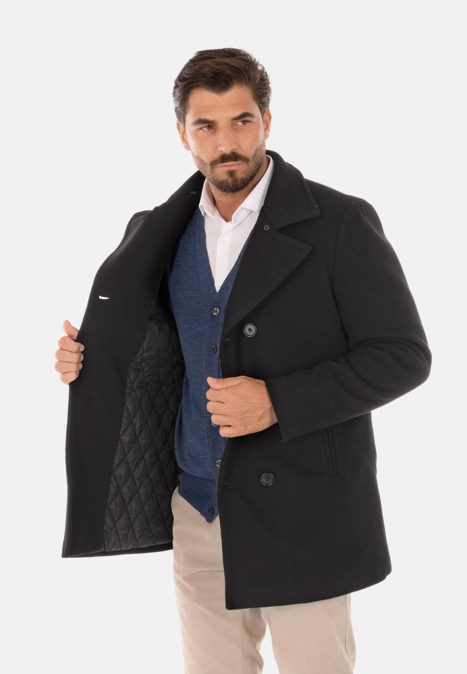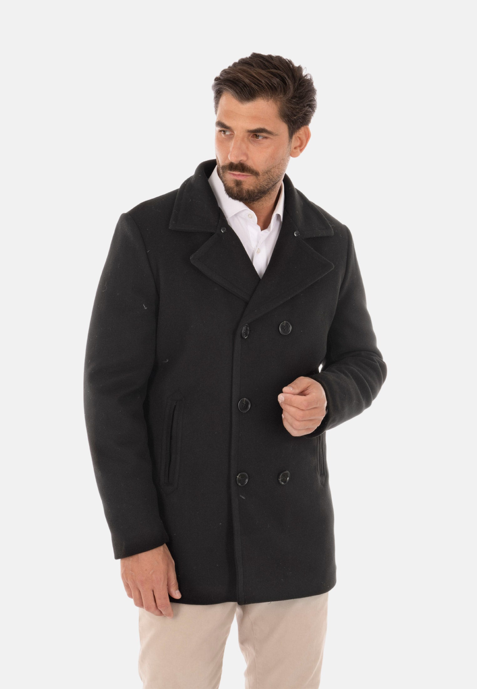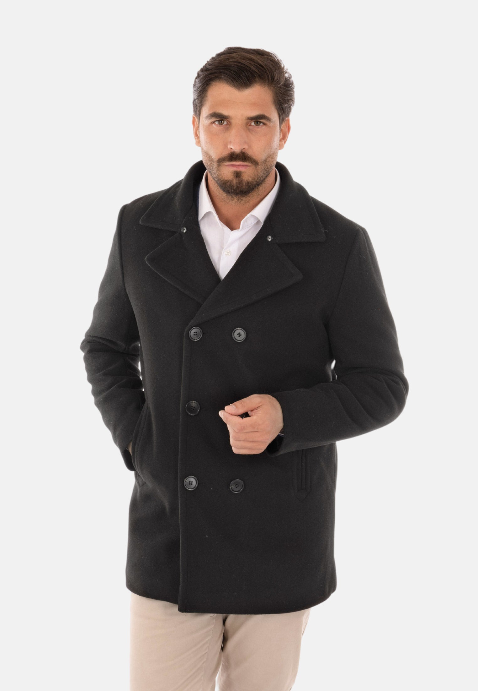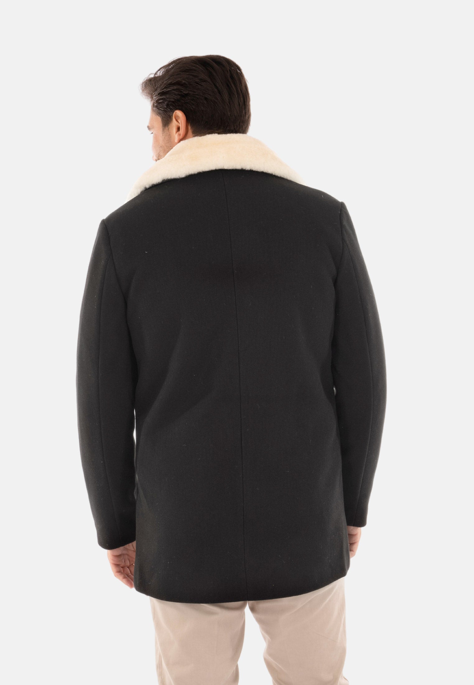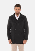 Cappotto doppiopetto uomo imbottito invernale nero con pelliccia sul collo staccabile. Cappottino in panno con fodera trapuntata, chiusura frontale con bottoni doppio petto, due tasche laterali e taschino interno. Giaccone lungo imbottito in piuma sintetica grazie alla sua imbottitura interna tiene molto caldi. Soprabito dalla vestibilità slim fit, molto pratico e comodo, stile casual versatile per un look sia classico che sportivo. Realizzato in 100%poliestere.