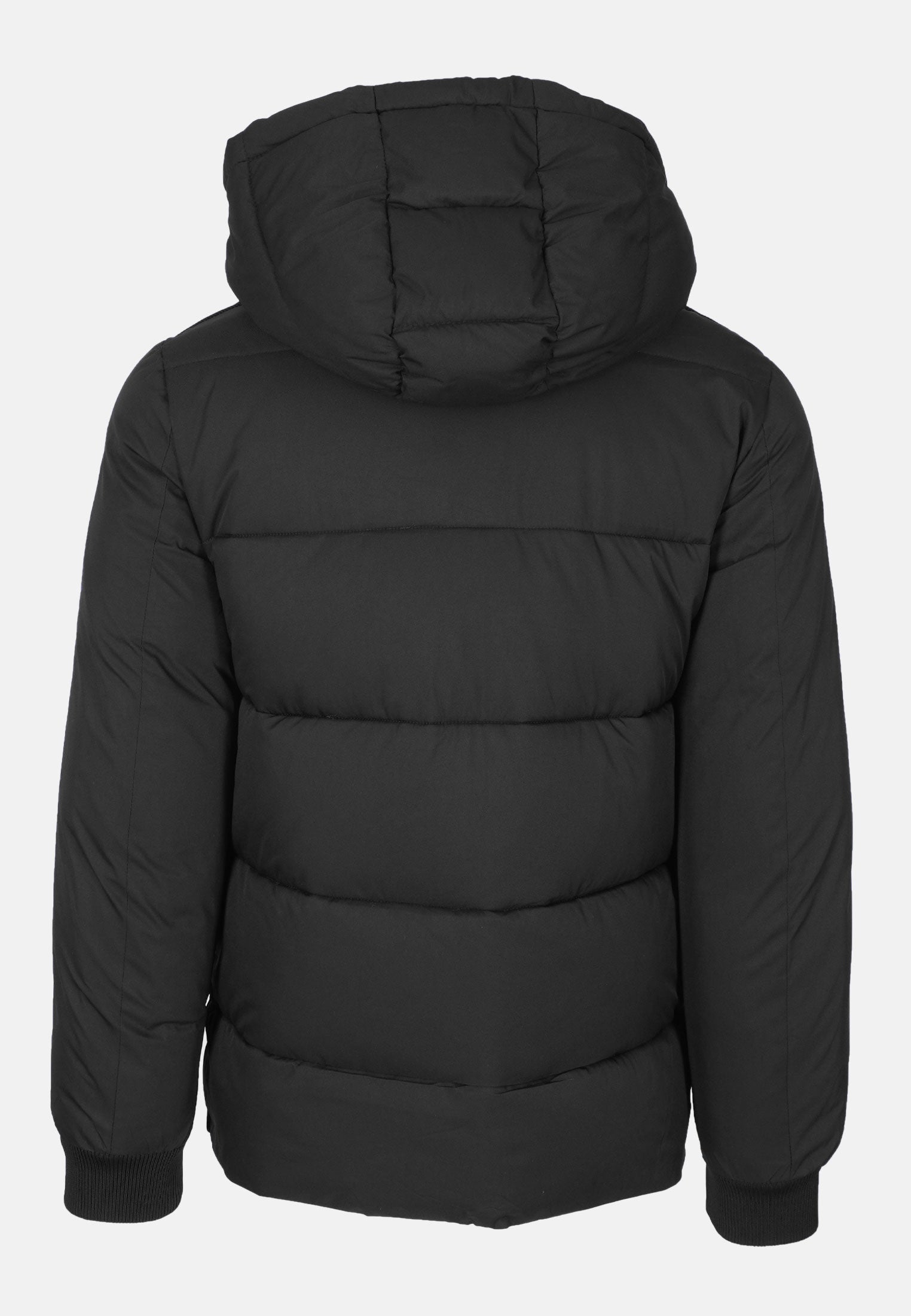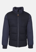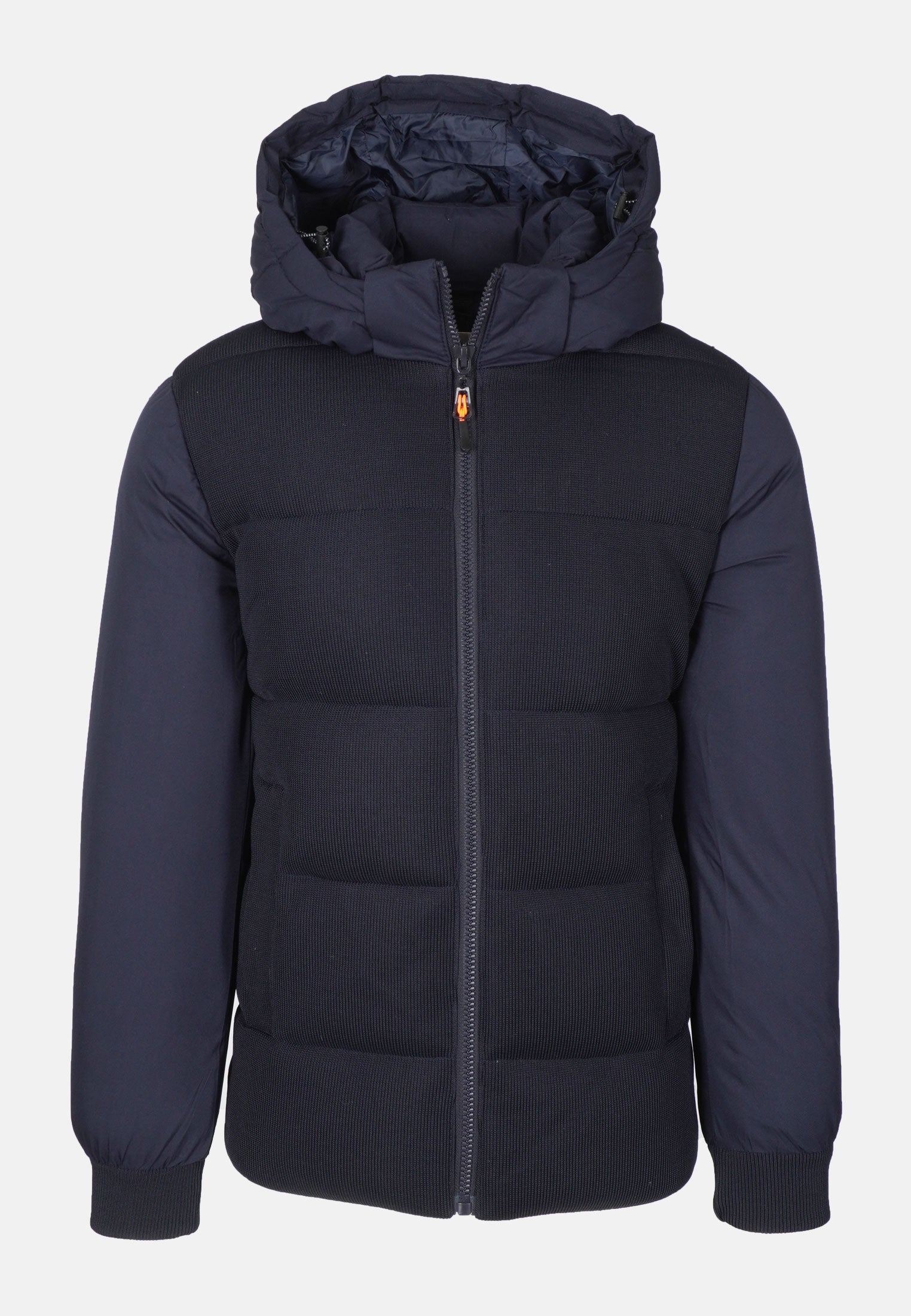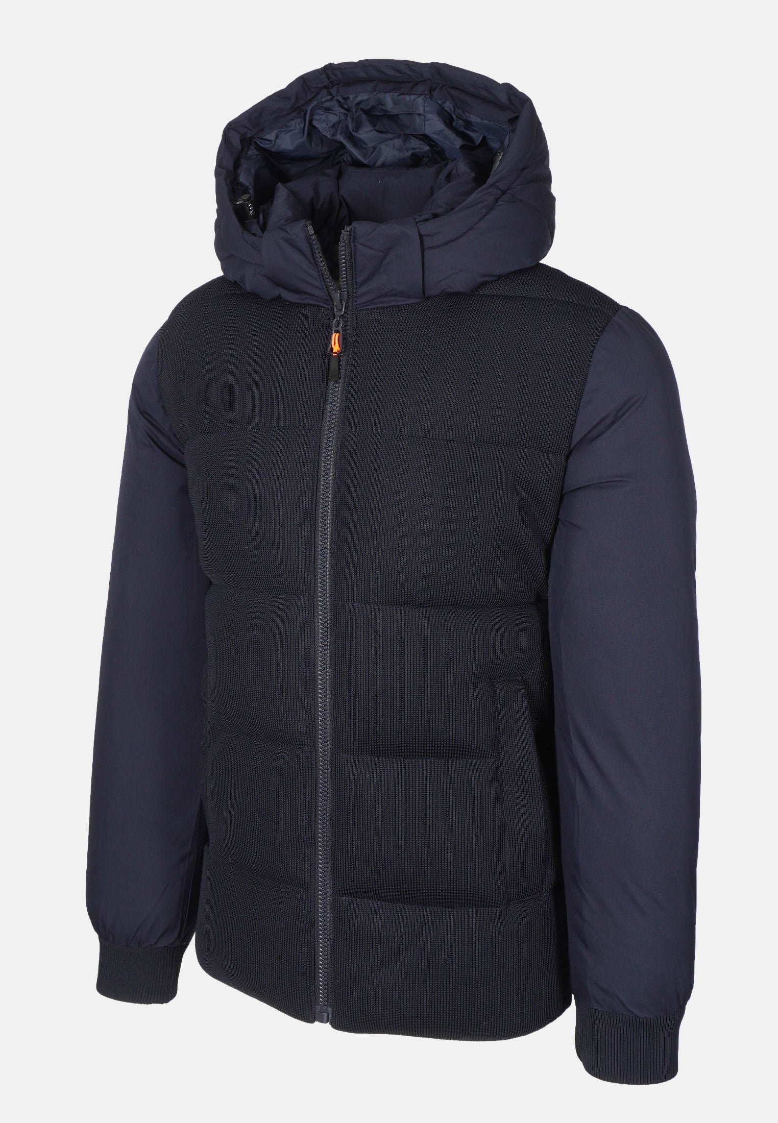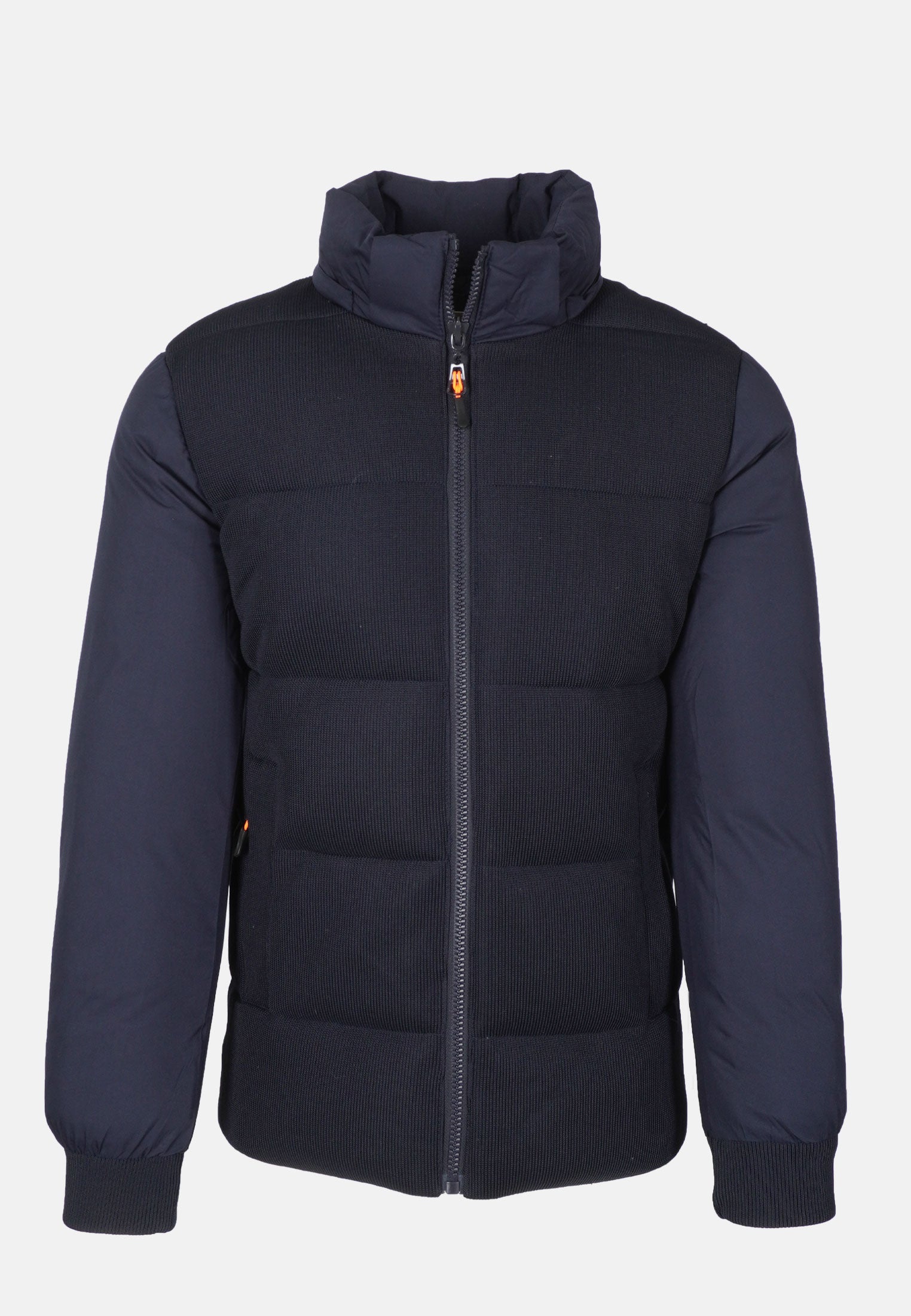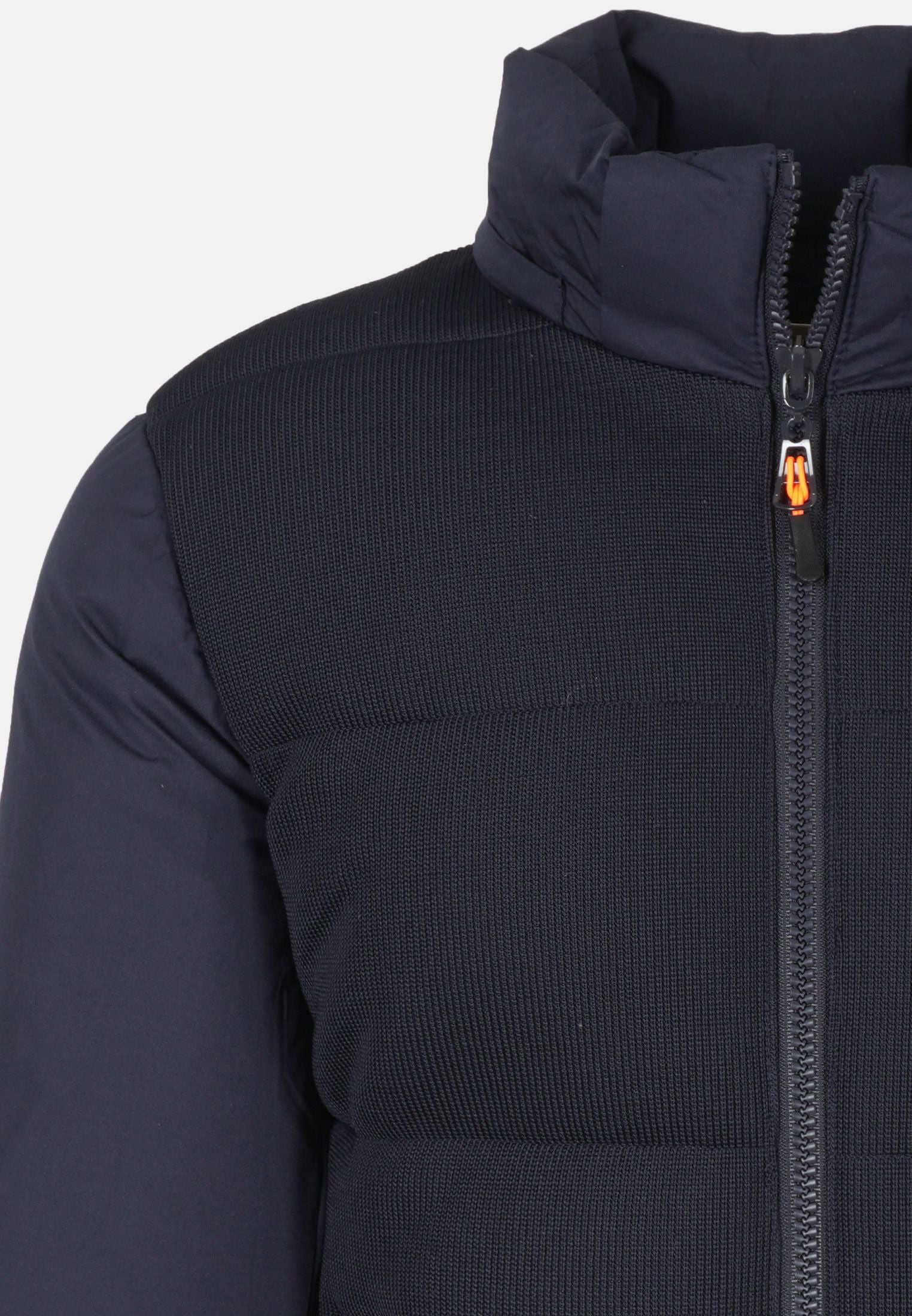 Il giubbotto invernale da uomo presenta una combinazione di tessuti: la parte frontale è in tessuto tipo maglia, elegante e strutturata, mentre le maniche e la schiena sono in tessuto tecnico liscio e impermeabile, ideale per proteggerti da vento, pioggia e umidità.