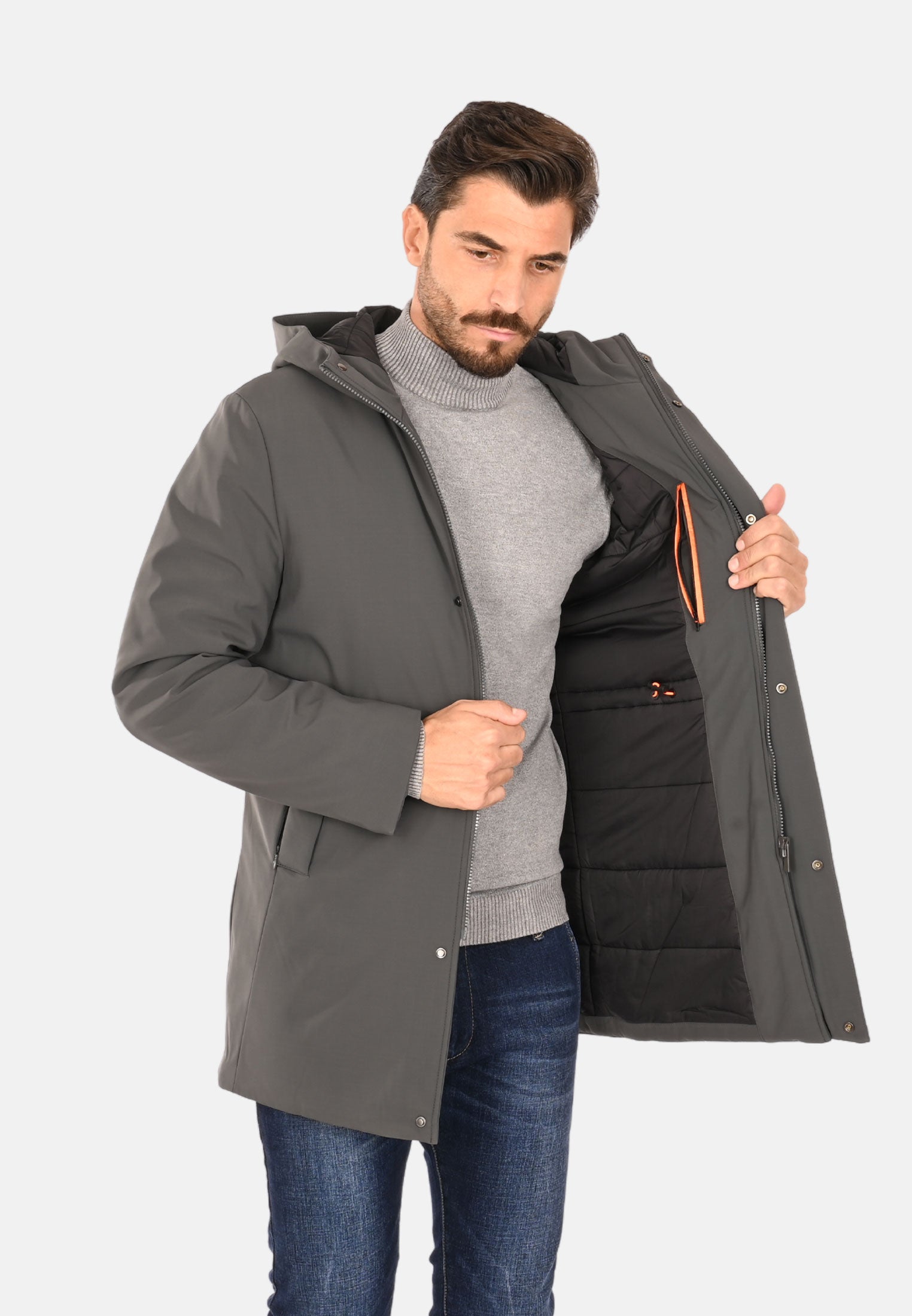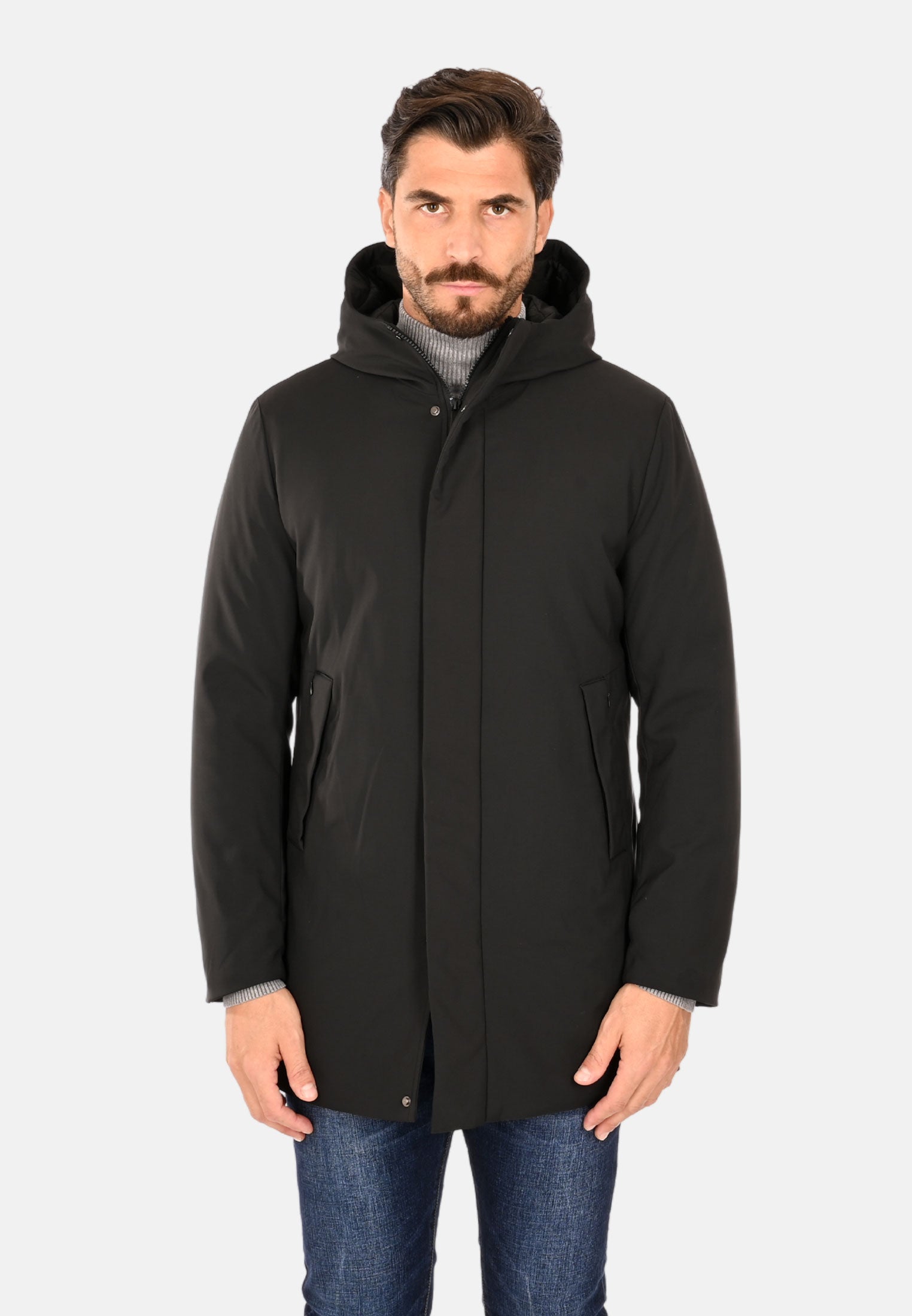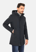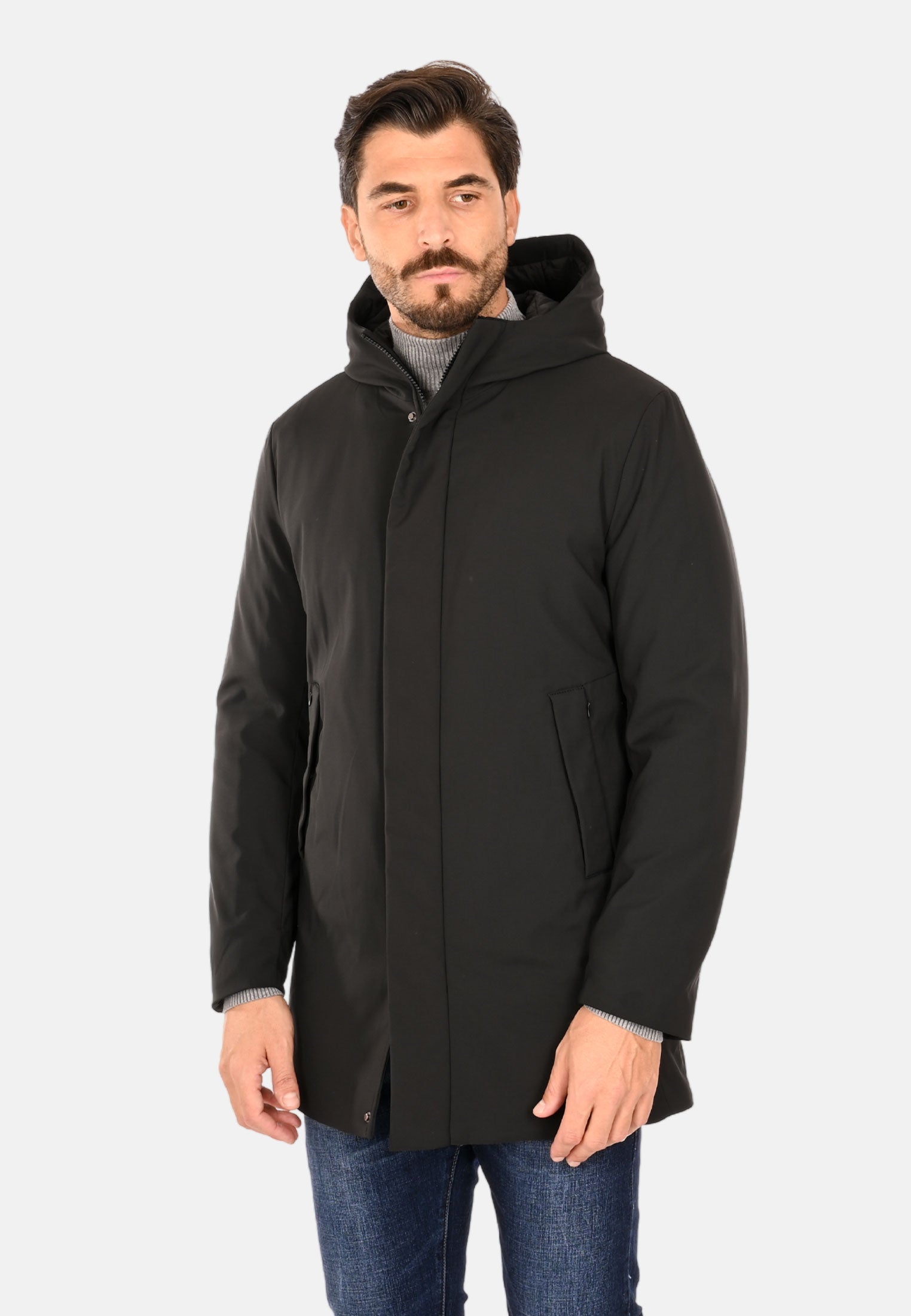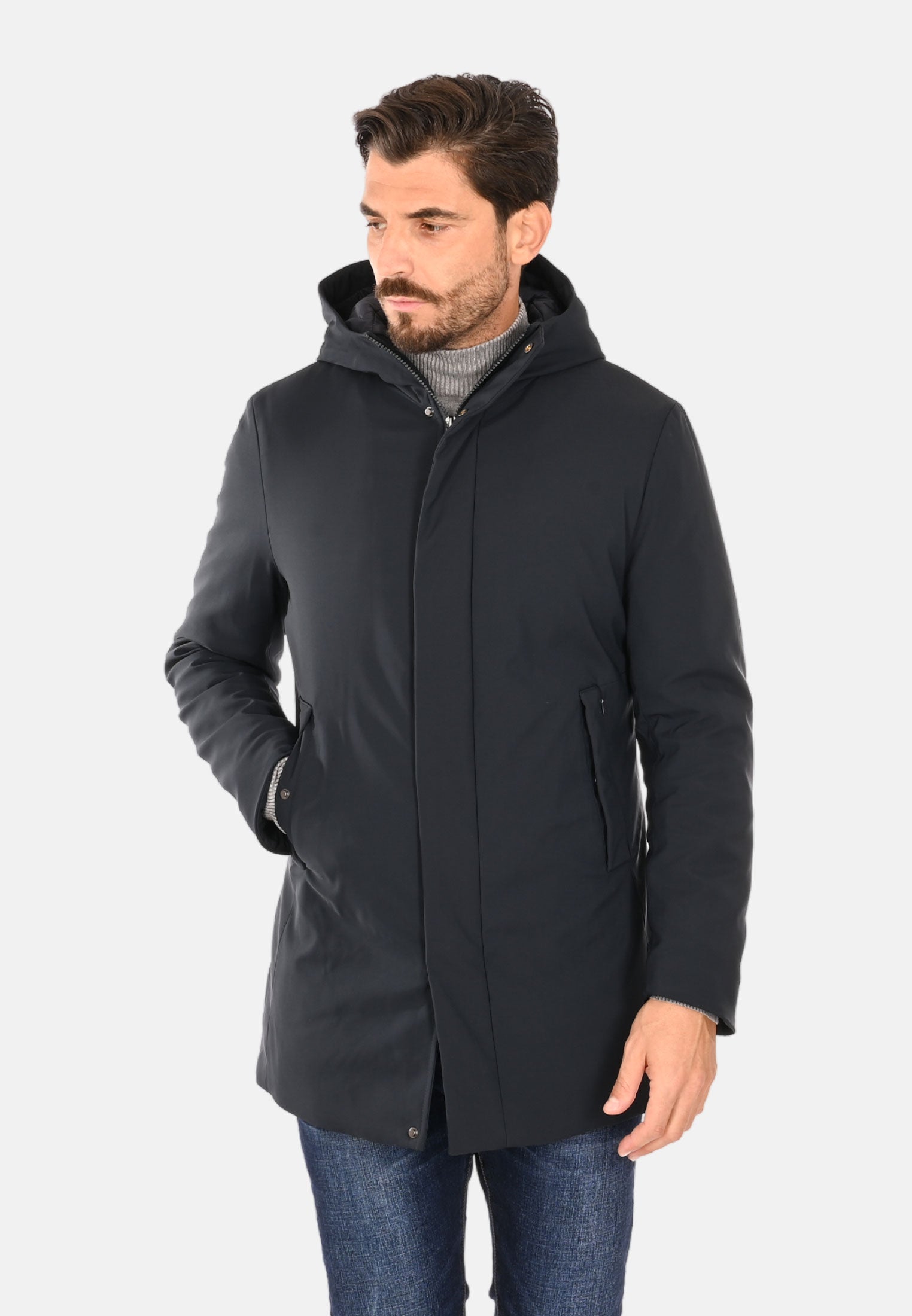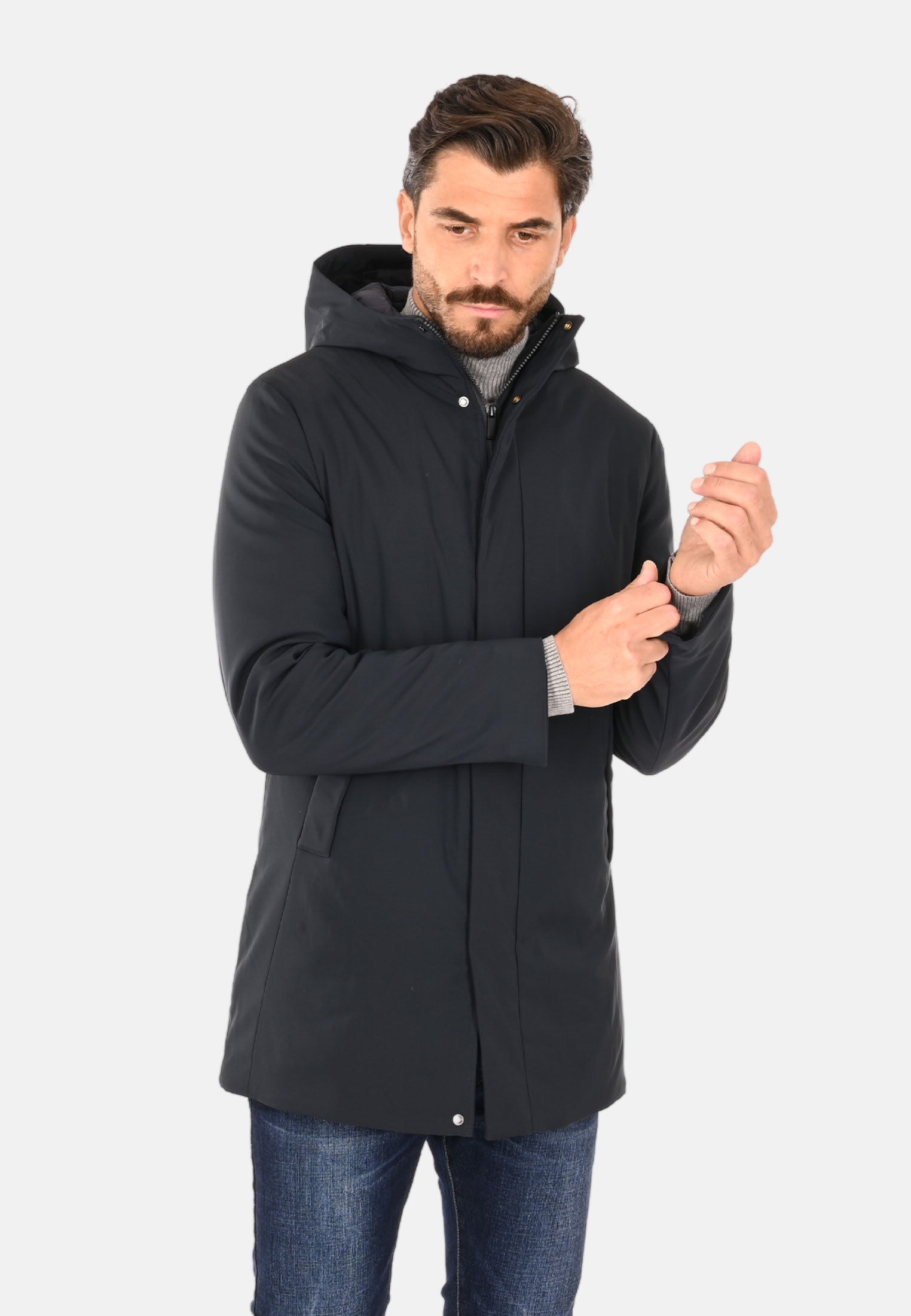 Parka uomo classico a tinta unita, colori blu e nero. Giubbotto lungo invernale con chiusura centrale a zip e bottoni su tutta la lunghezza. Giacca lunga calda con cappuccio e vestibilità comoda. Giaccone lungo, interno imbottito con pratiche tasche laterali a zip con patte e taschino interno. Trench lungo impermeabile con elastico al girovita interno per regolare la vestibilità.