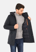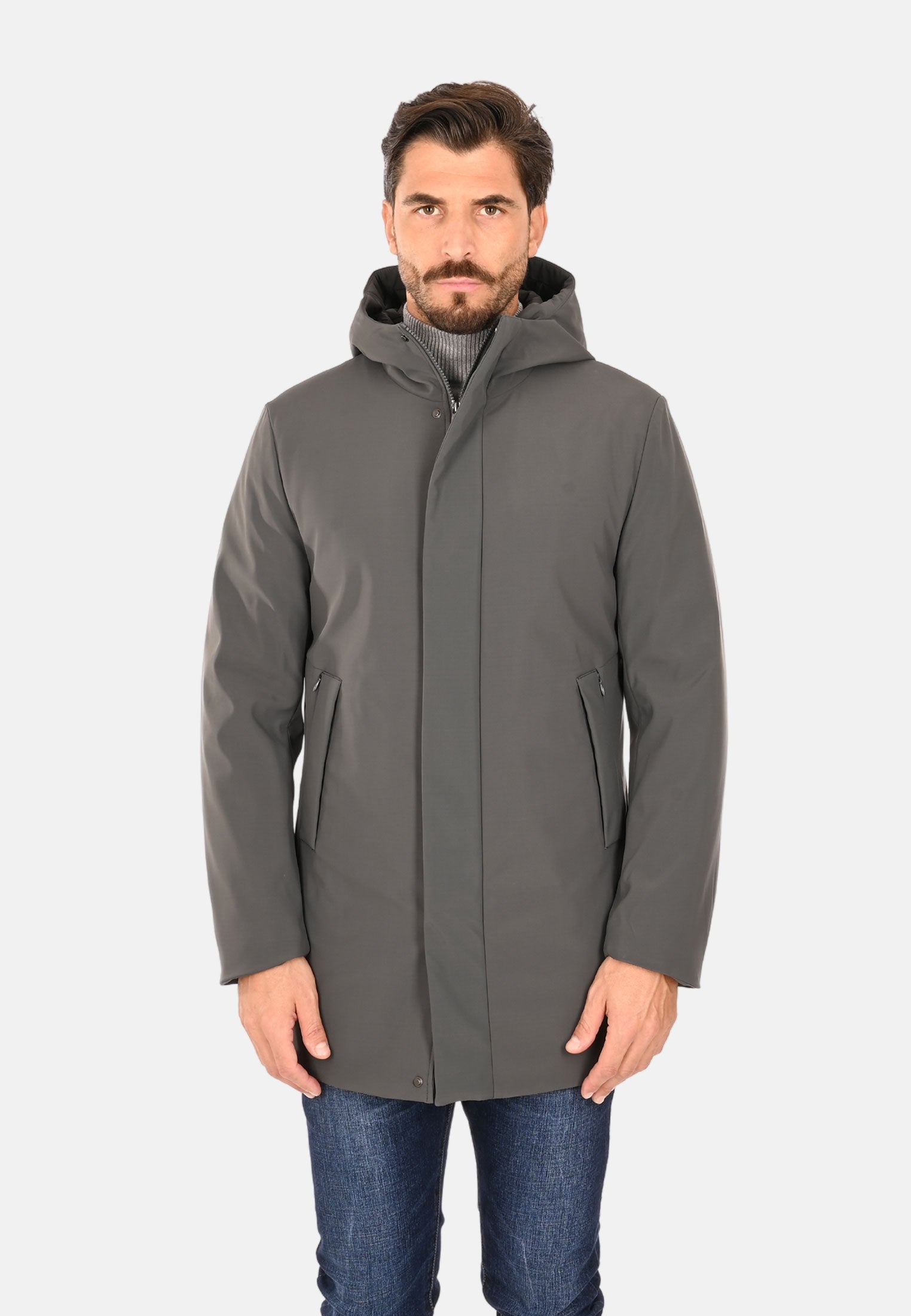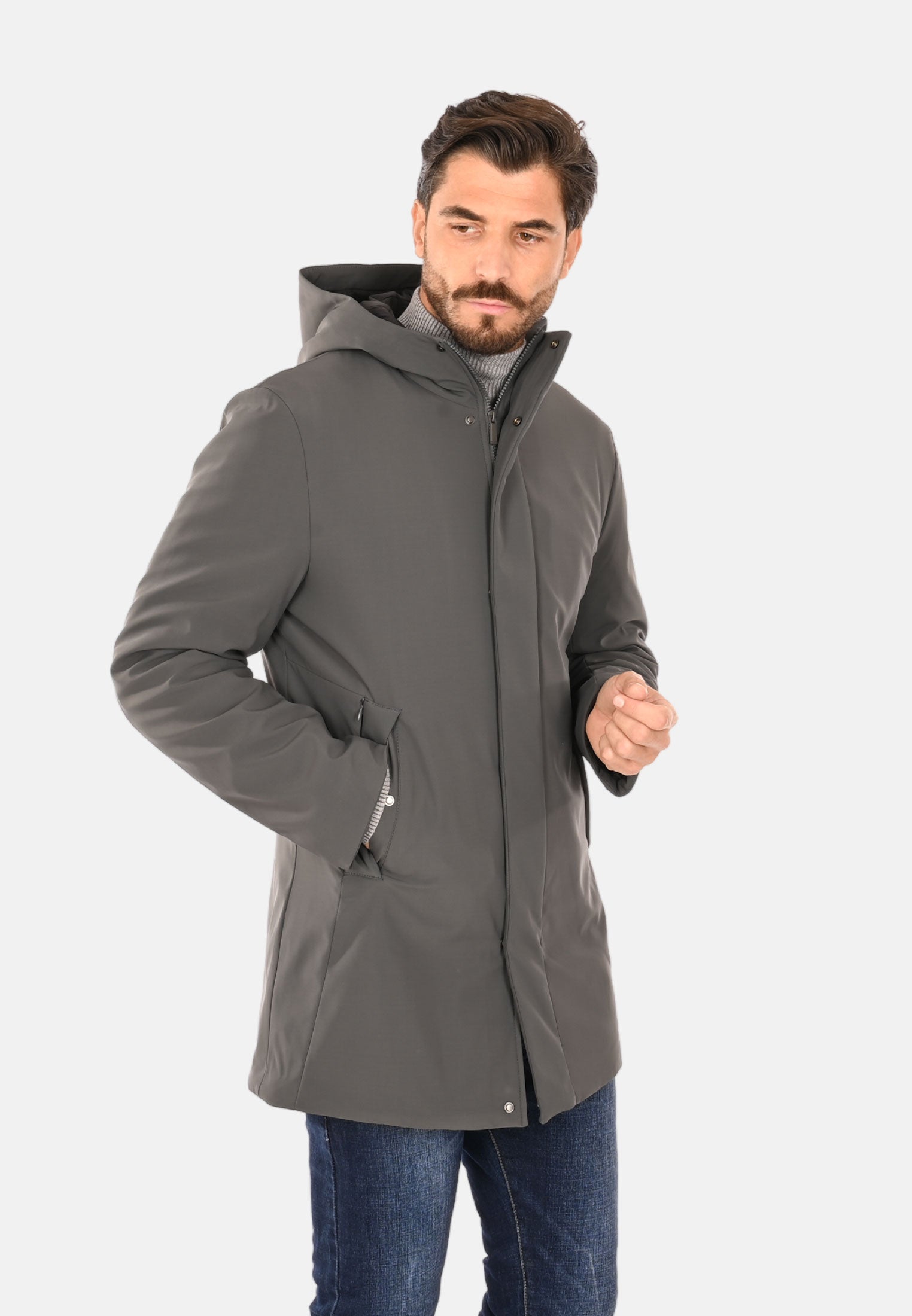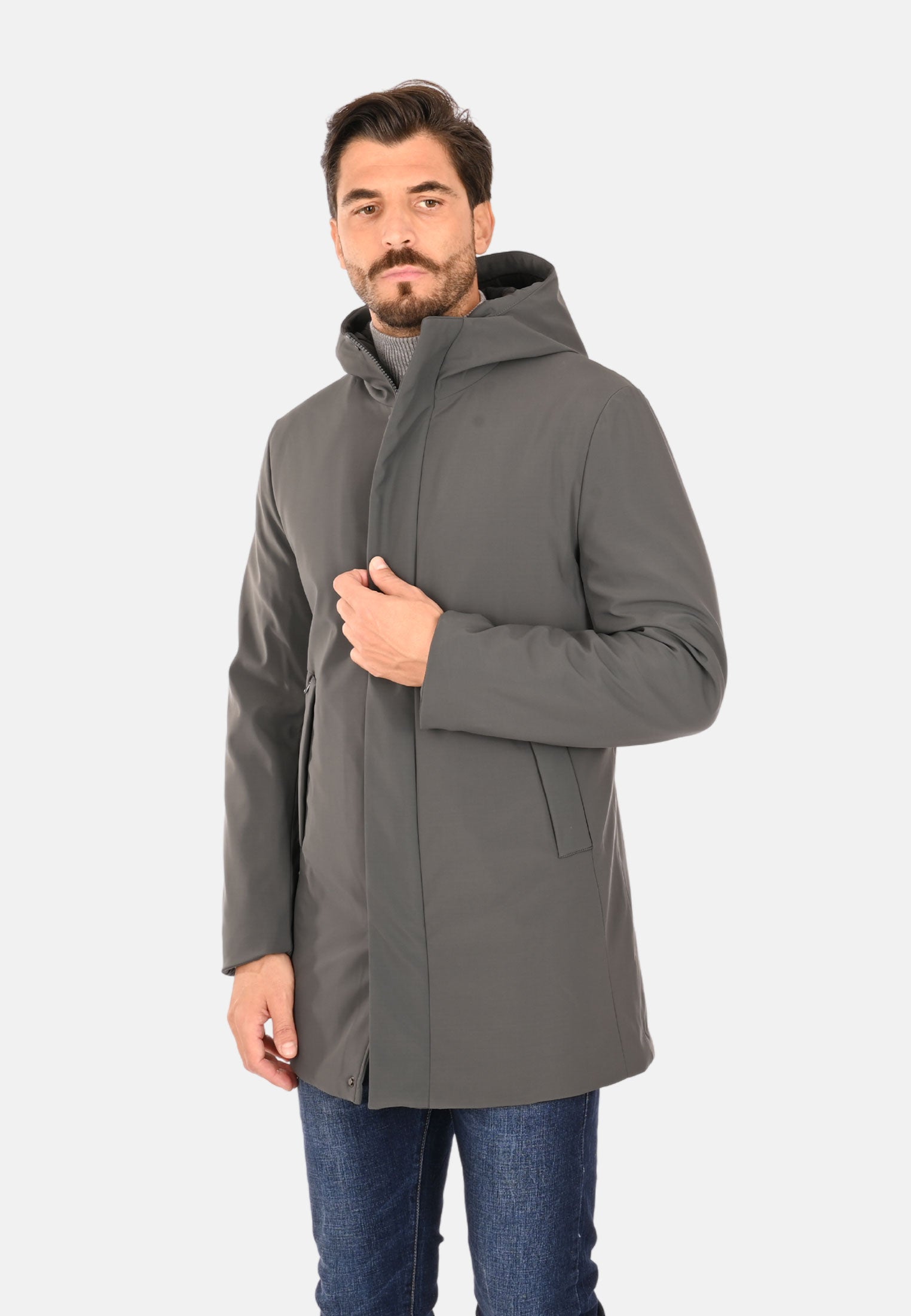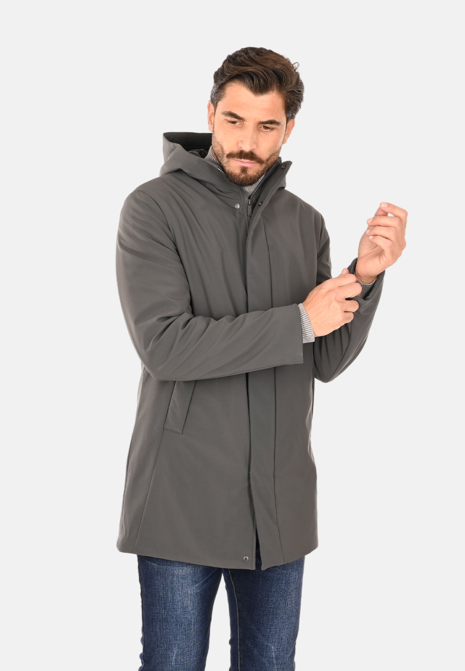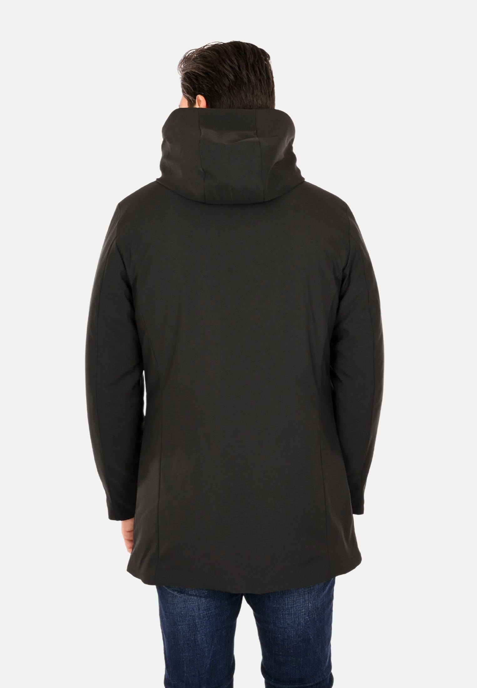 Parka uomo classico a tinta unita, colori blu e nero. Giubbotto lungo invernale con chiusura centrale a zip e bottoni su tutta la lunghezza. Giacca lunga calda con cappuccio e vestibilità comoda. Giaccone lungo, interno imbottito con pratiche tasche laterali a zip con patte e taschino interno. Trench lungo impermeabile con elastico al girovita interno per regolare la vestibilità.