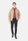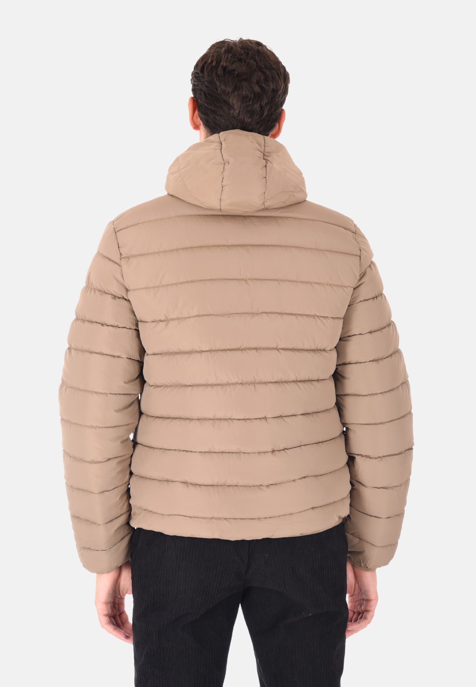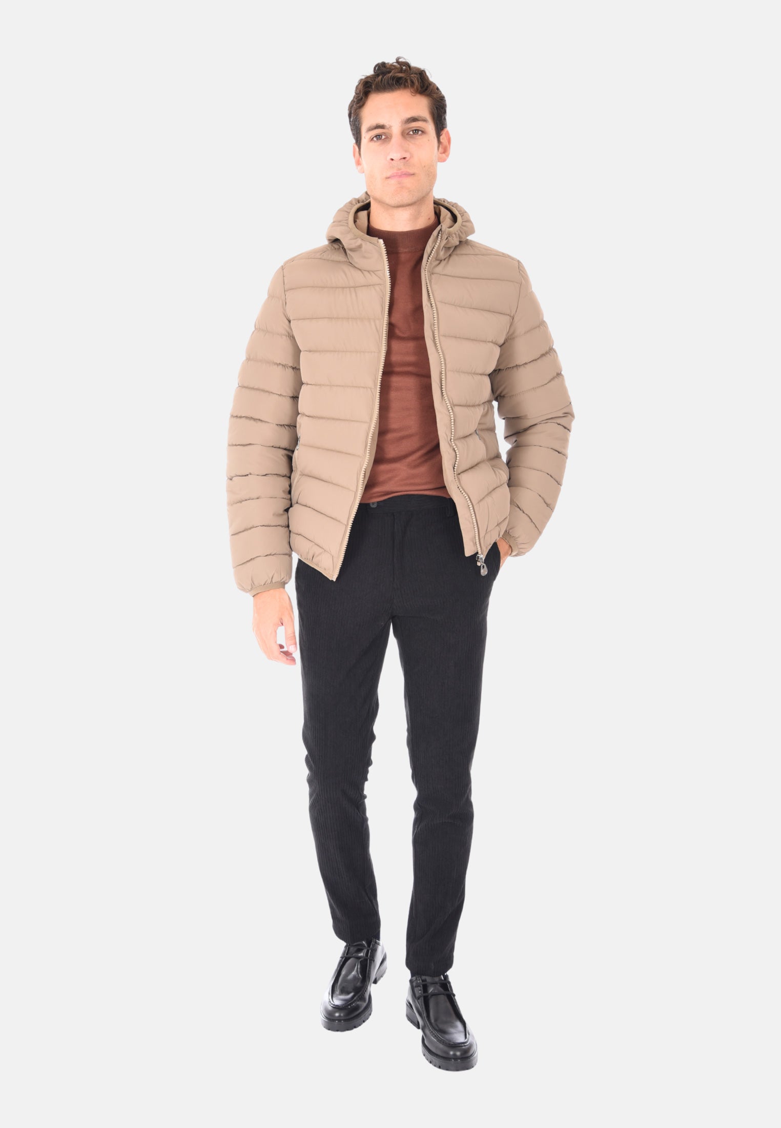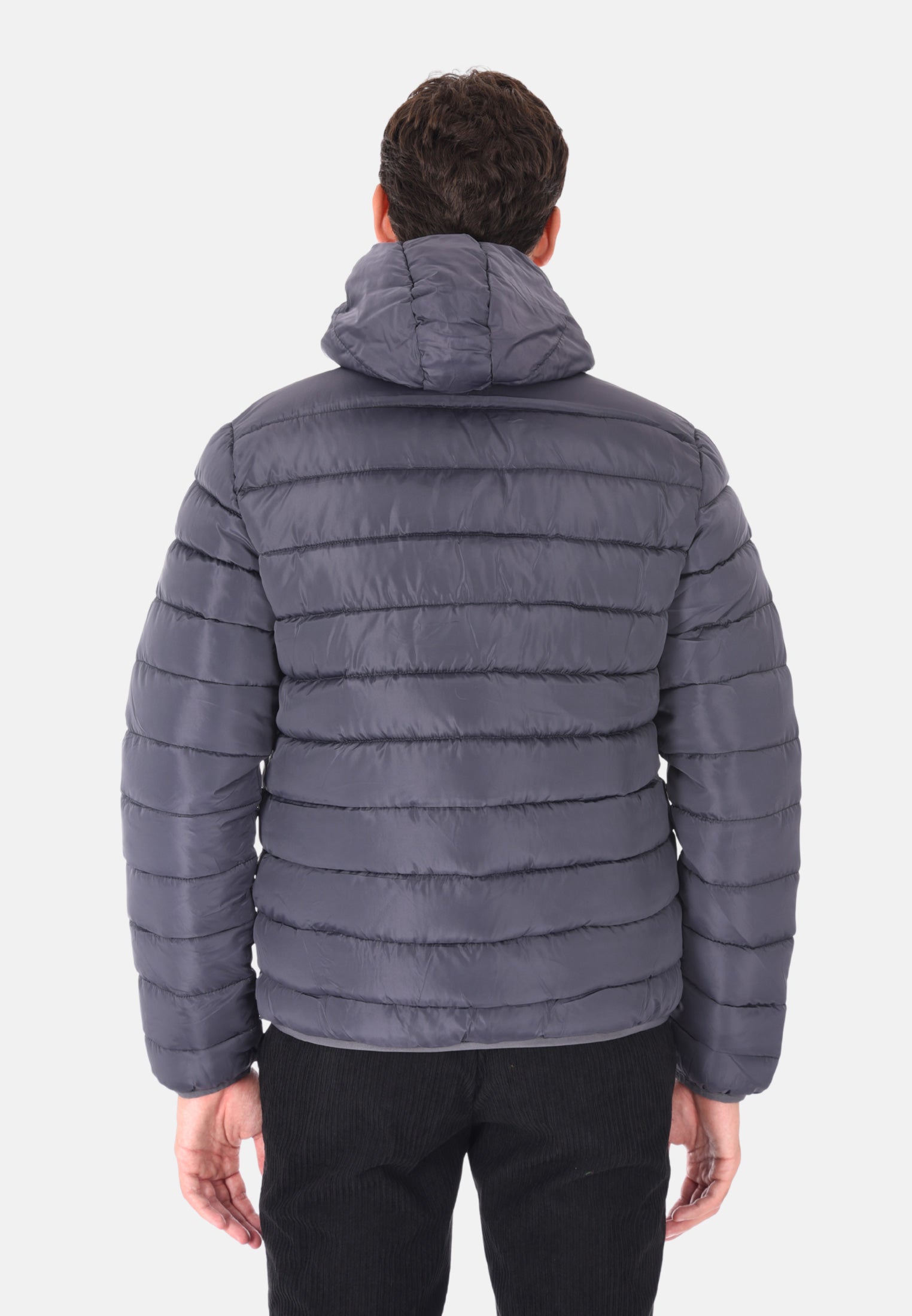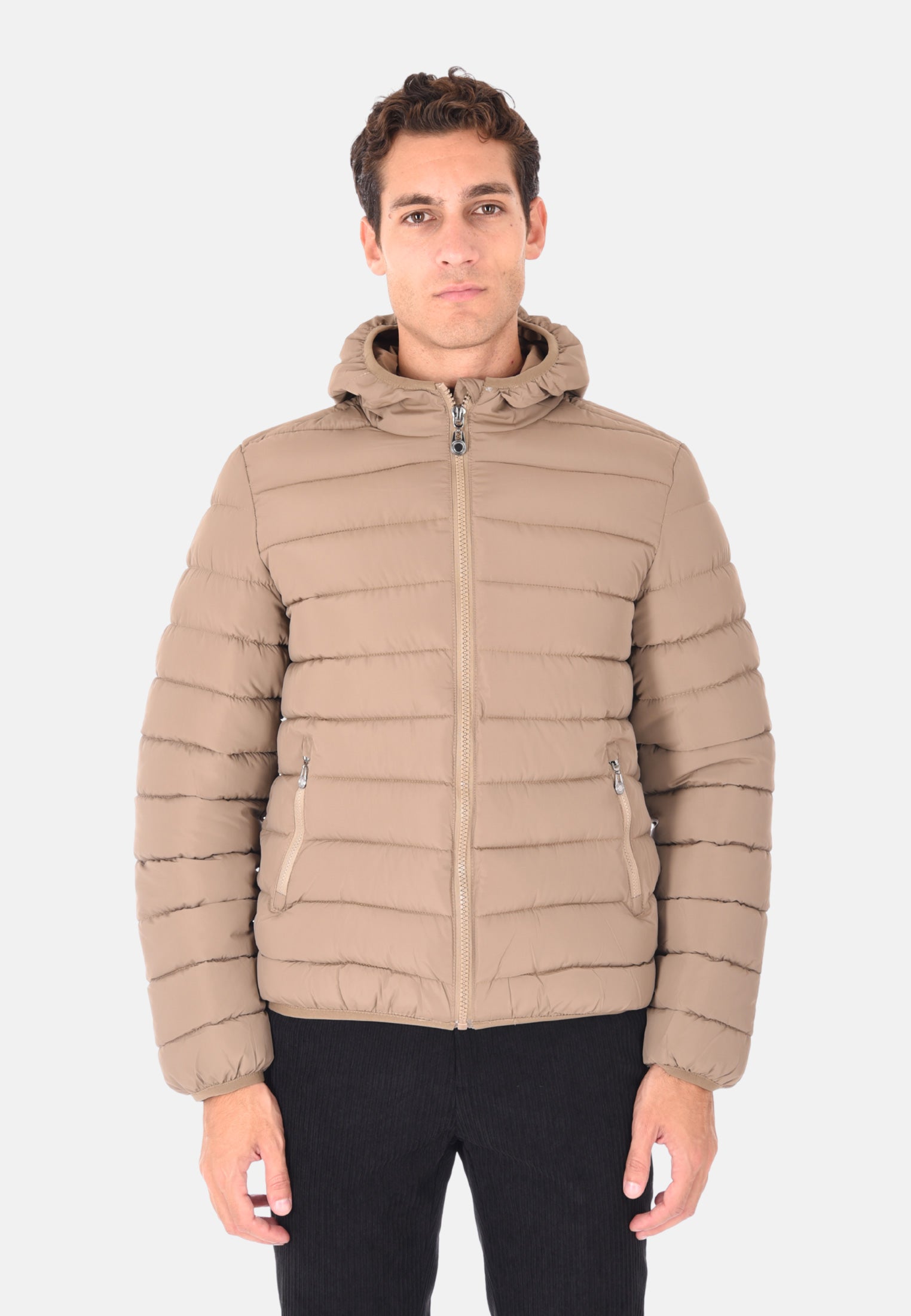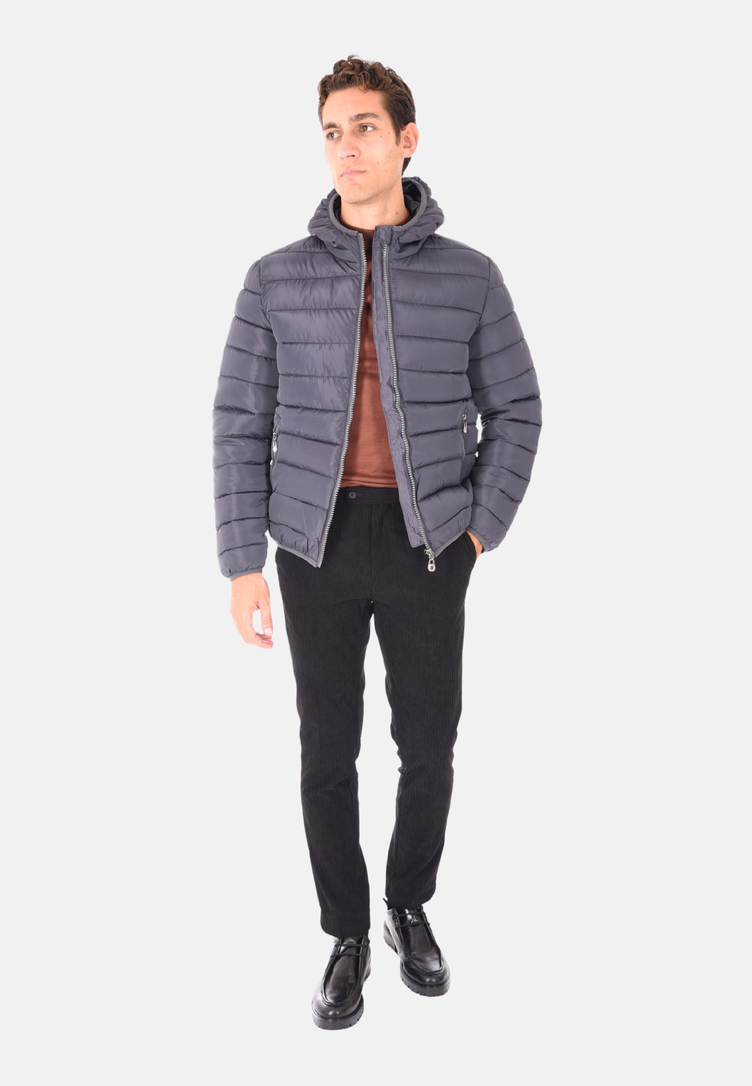 Giubbino uomo dalla vestibilità slim con cappuccio, in cinque colori nero, blu, beige, grigio e verde. Piumino con imbottitura di 200 grammi, resistento al vento e al freddo. Bomber invernale con chiusura anteriore con cerniera, due