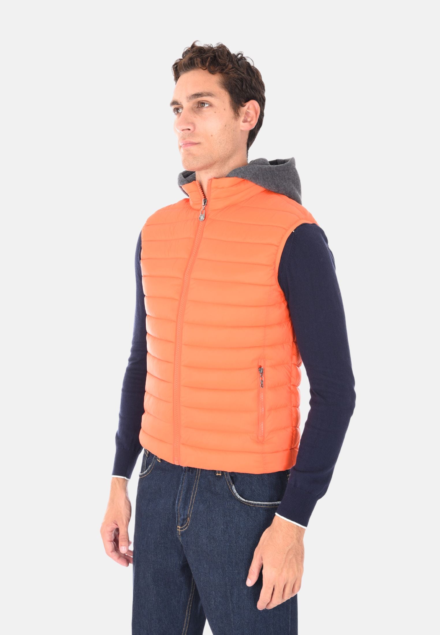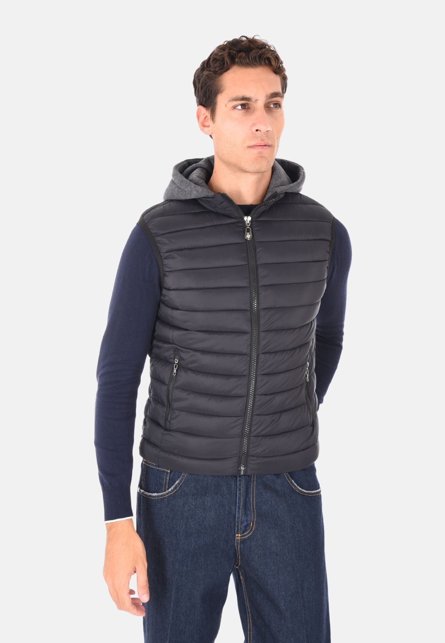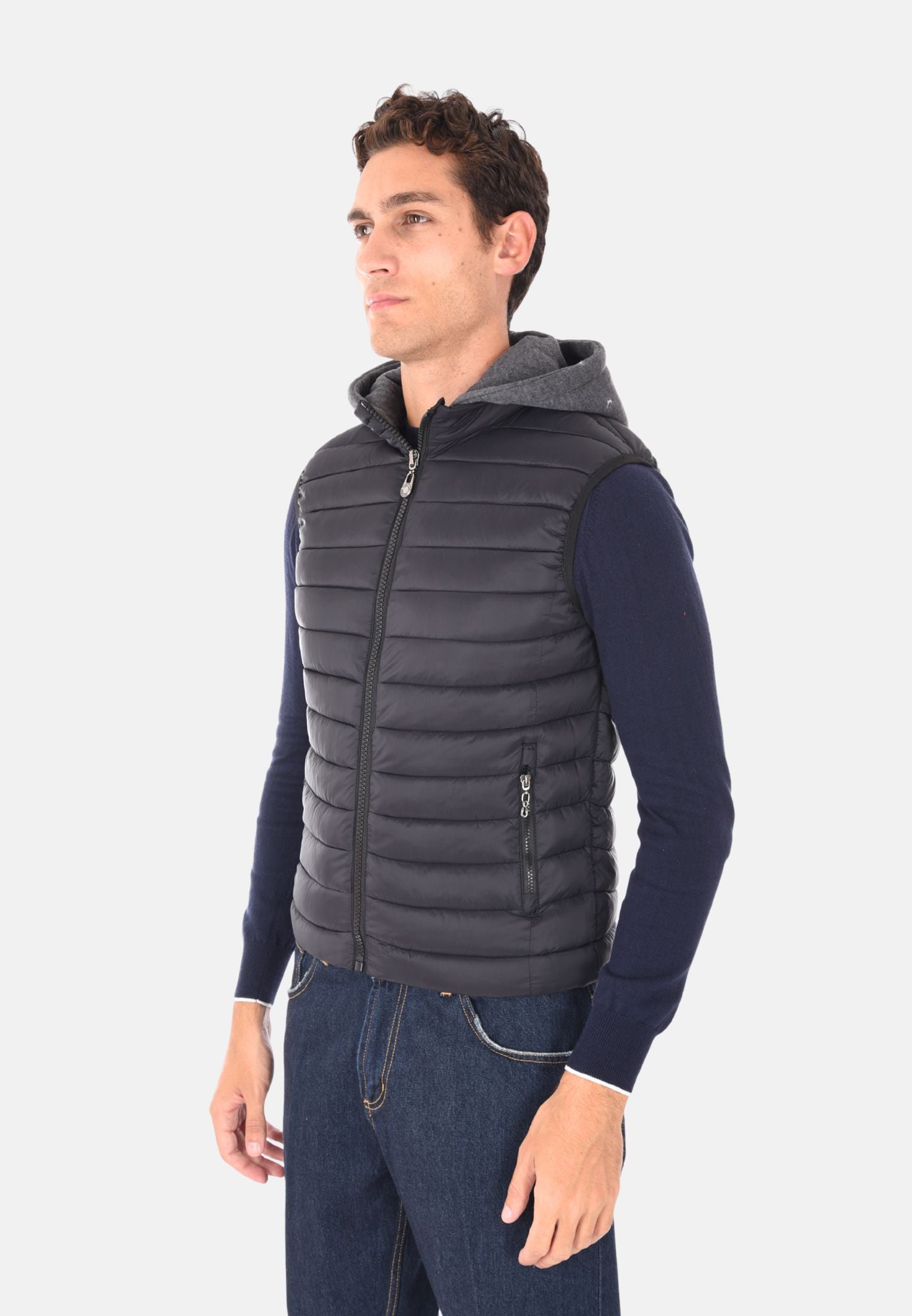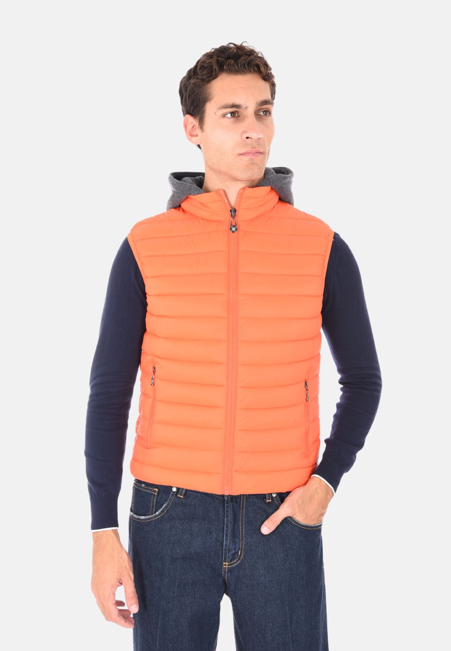 Giubbotto smanicato imbottito 100 grammi ideale per l'inverno e le mezze stagioni, perfetto da indossare sopra felpe e maglioni per un look casual e funzionale. Il giubbotto smanicato presenta un cappuccio in felpa rimovibile, che aggiunge versatilità e protezione extra contro vento e freddo. Dotato di due tasche laterali con chiusura a zip e chiusura con zip frontale a tutta lunghezza, unisce stile e praticità. Gli elastici regolabili nascosti sul fondo consentono una vestibilità più aderente, mentre la trapuntatura orizzontale dona un tocco moderno e sportivo. Realizzato in 100% nylon, si distingue per la vestibilità slim fit. Disponibile in 10 colori e nelle taglie da M a 3XL. Il modello in foto è alto 1,85 m e indossa la taglia L.