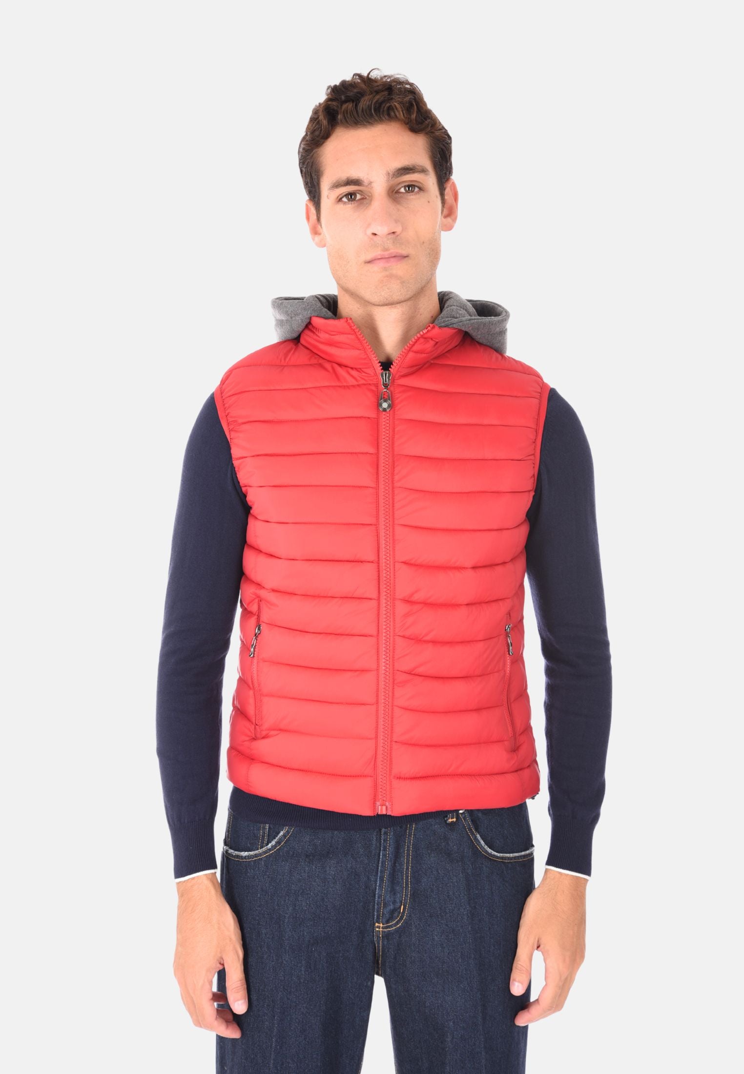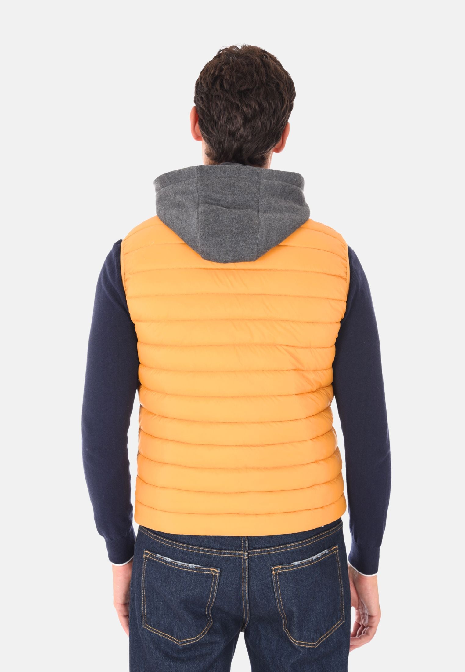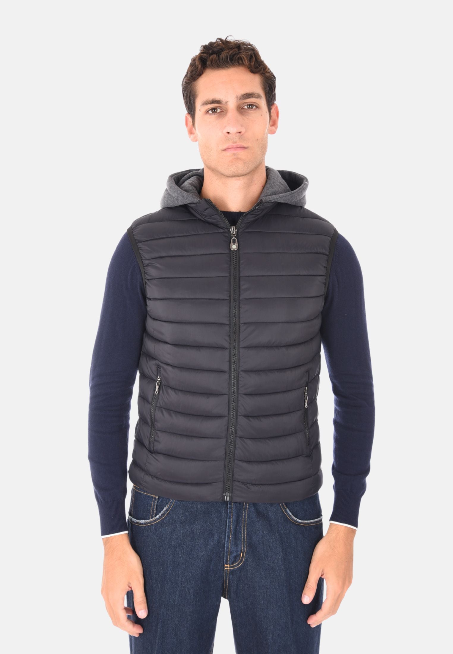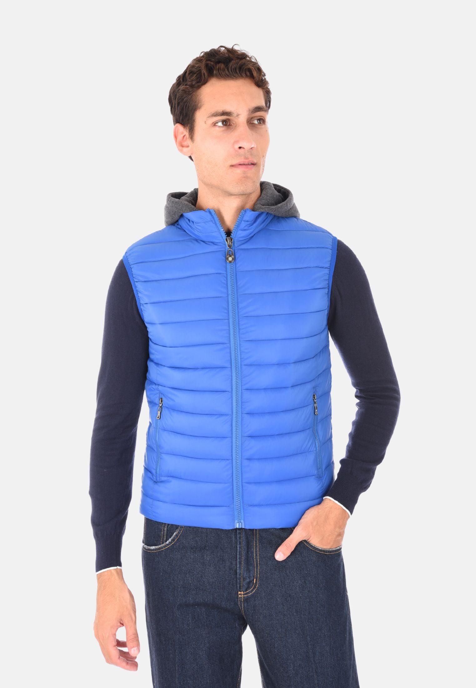 Giubbotto smanicato imbottito 100 grammi ideale per l'inverno e le mezze stagioni, perfetto da indossare sopra felpe e maglioni per un look casual e funzionale. Il giubbotto smanicato presenta un cappuccio in felpa rimovibile, che aggiunge versatilità e protezione extra contro vento e freddo. Dotato di due tasche laterali con chiusura a zip e chiusura con zip frontale a tutta lunghezza, unisce stile e praticità. Gli elastici regolabili nascosti sul fondo consentono una vestibilità più aderente, mentre la trapuntatura orizzontale dona un tocco moderno e sportivo. Realizzato in 100% nylon, si distingue per la vestibilità slim fit. Disponibile in 10 colori e nelle taglie da M a 3XL. Il modello in foto è alto 1,85 m e indossa la taglia L.