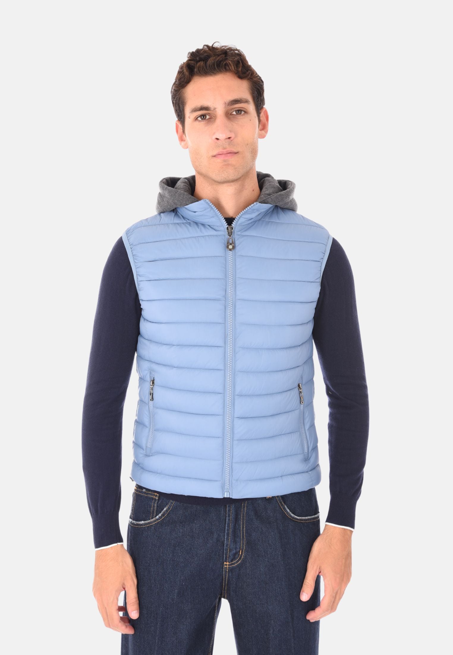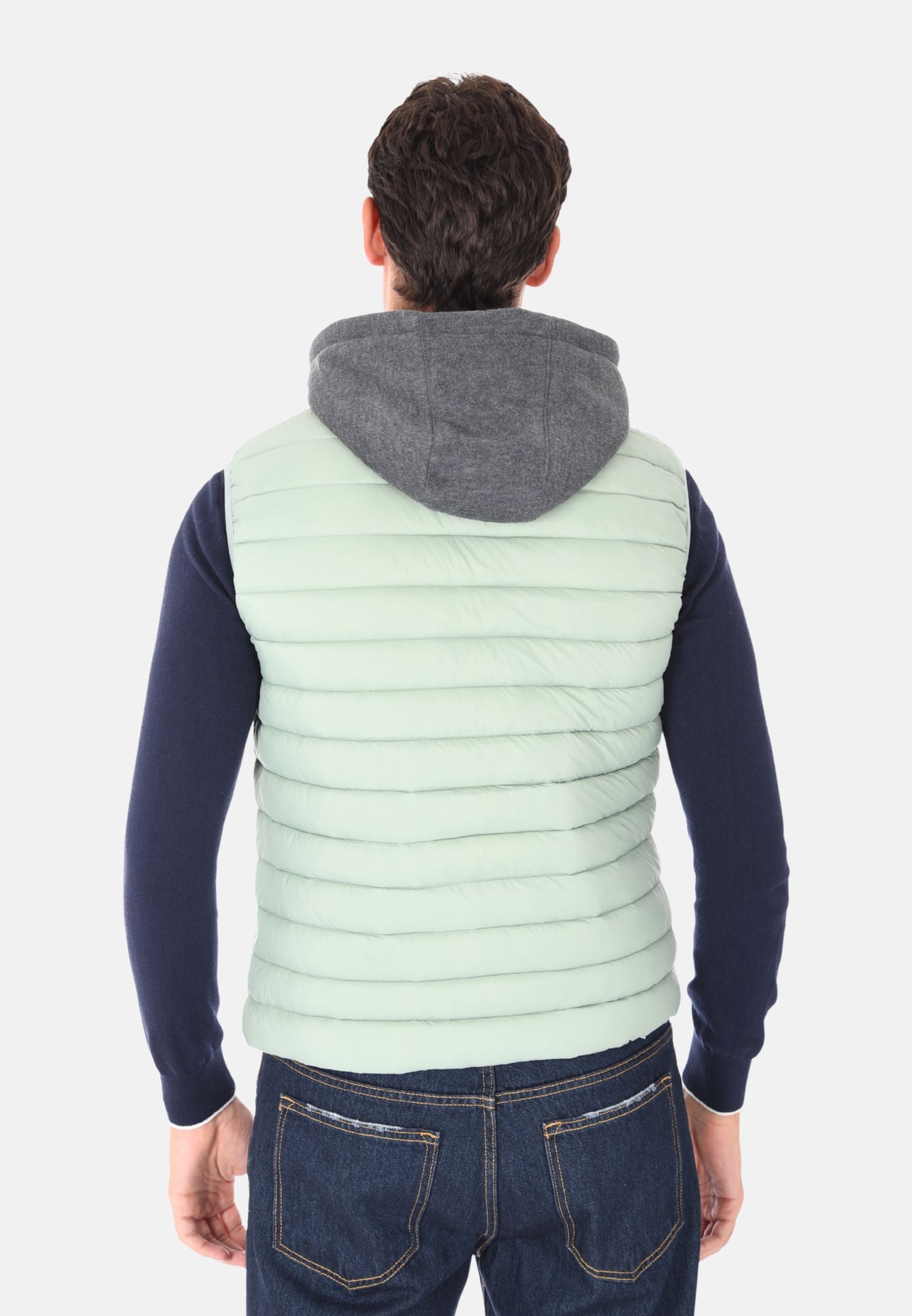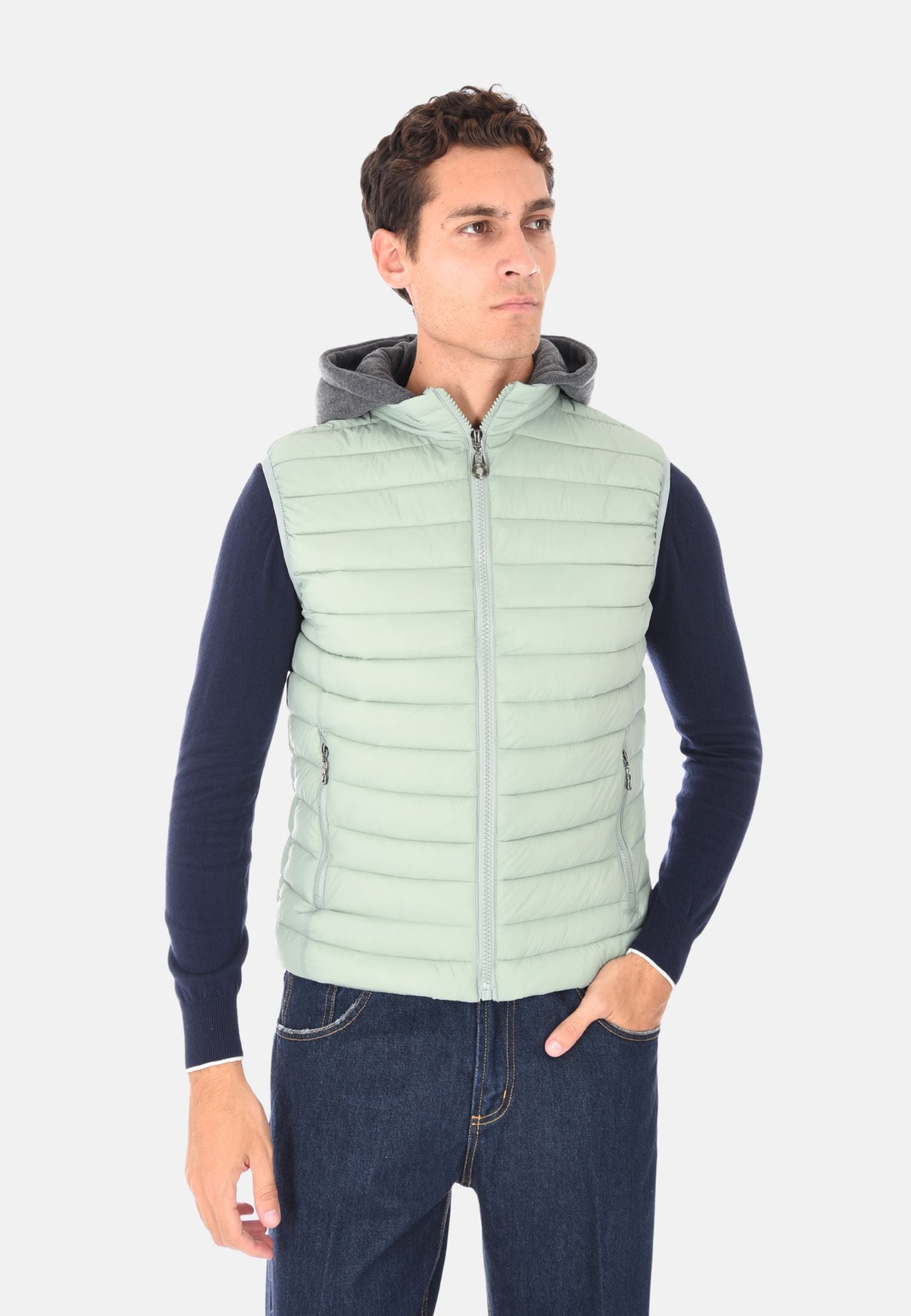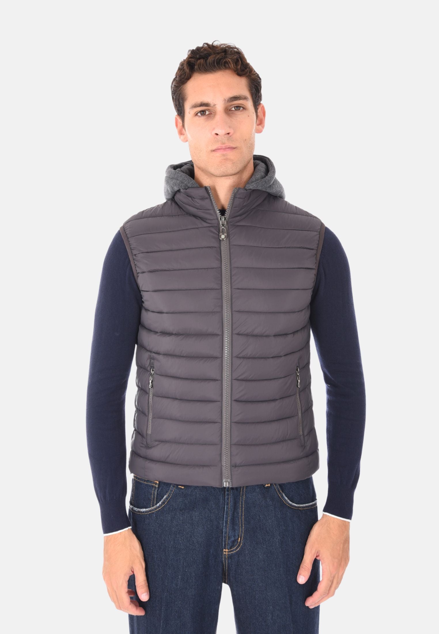 Giubbotto smanicato imbottito 100 grammi ideale per l'inverno e le mezze stagioni, perfetto da indossare sopra felpe e maglioni per un look casual e funzionale. Il giubbotto smanicato presenta un cappuccio in felpa rimovibile, che aggiunge versatilità e protezione extra contro vento e freddo. Dotato di due tasche laterali con chiusura a zip e chiusura con zip frontale a tutta lunghezza, unisce stile e praticità. Gli elastici regolabili nascosti sul fondo consentono una vestibilità più aderente, mentre la trapuntatura orizzontale dona un tocco moderno e sportivo. Realizzato in 100% nylon, si distingue per la vestibilità slim fit. Disponibile in 10 colori e nelle taglie da M a 3XL. Il modello in foto è alto 1,85 m e indossa la taglia L.