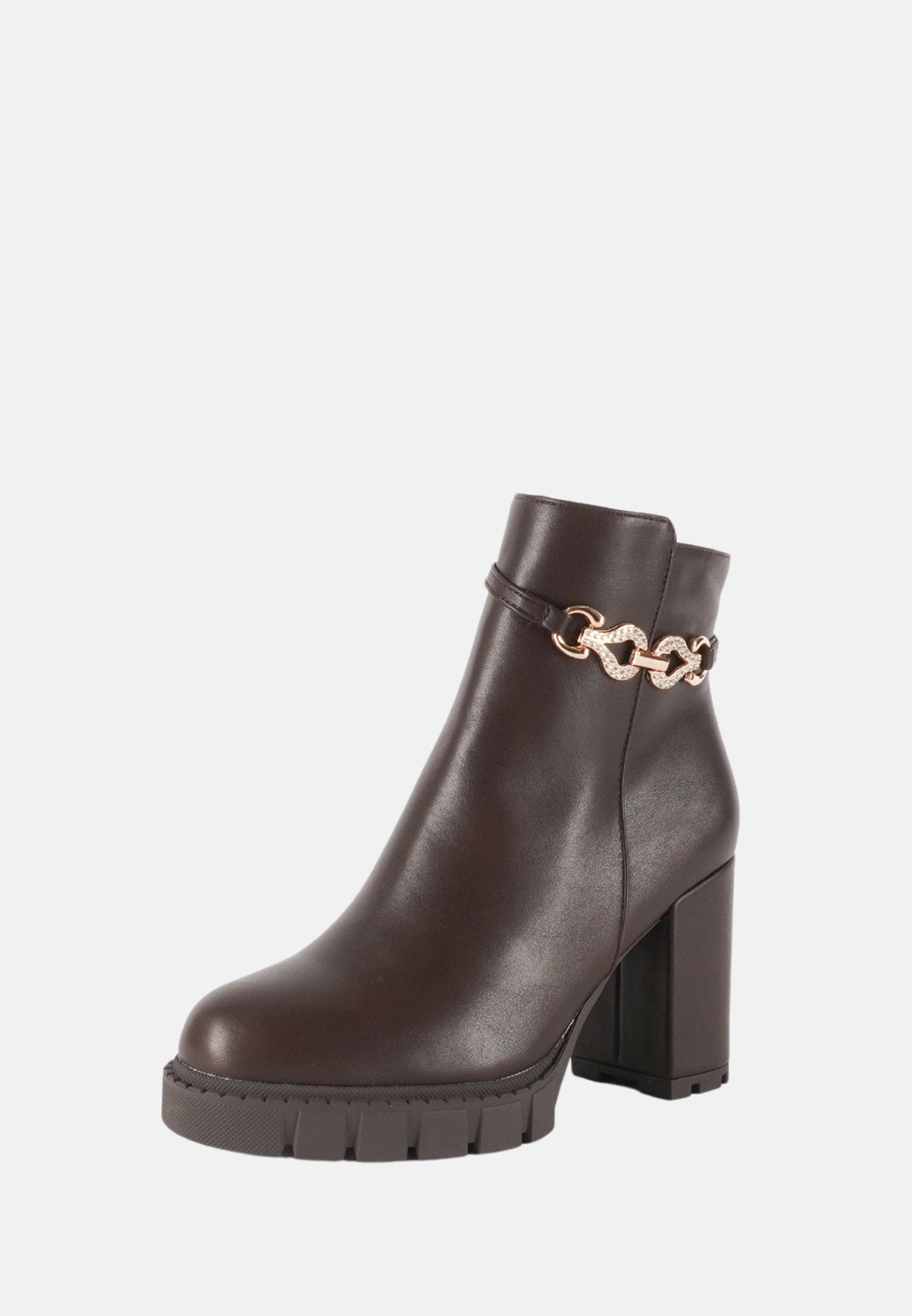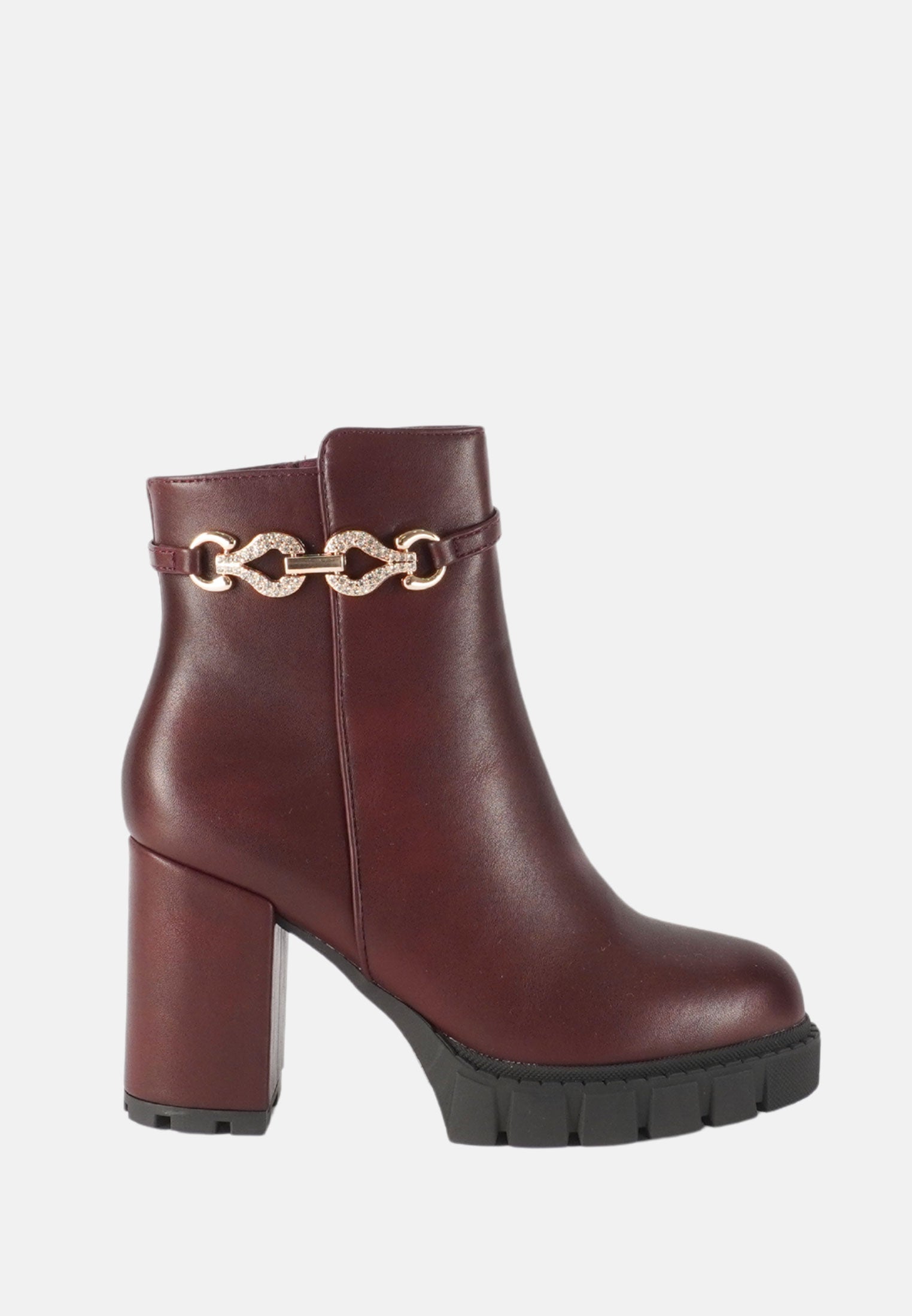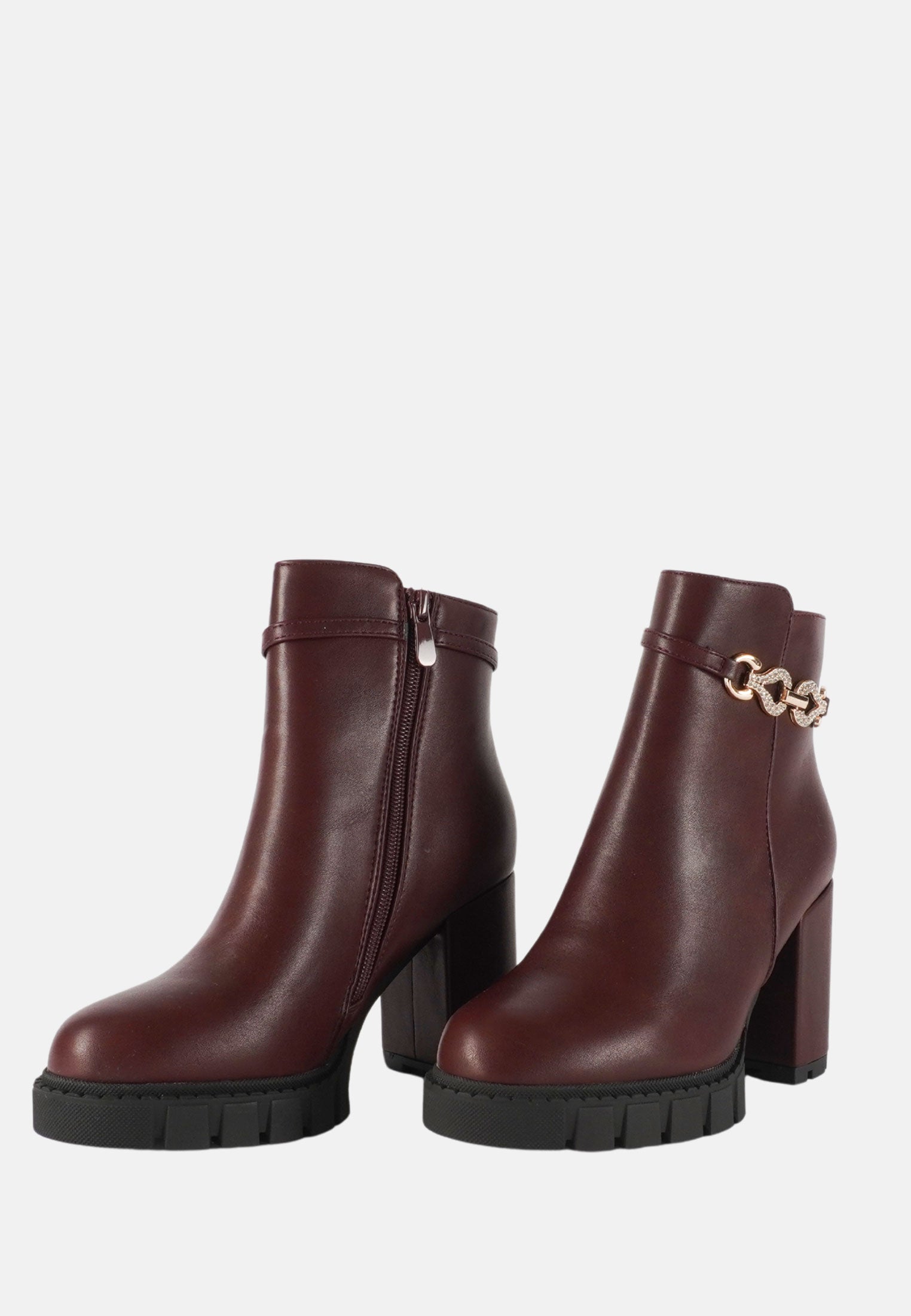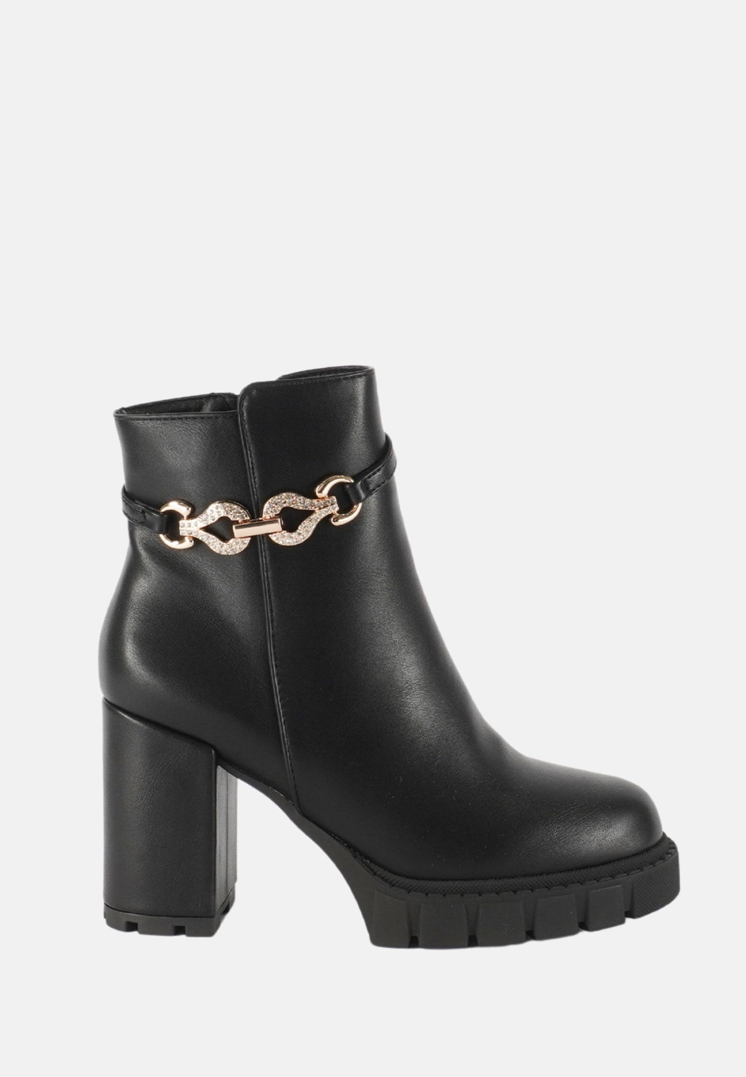 Raffinati e grintosi allo stesso tempo, questi tronchetti donna con tacco alto sono il perfetto equilibrio tra eleganza e comfort. Realizzati in morbida pelle sintetica effetto liscio, avvolgono la caviglia con una linea pulita e femminile, impreziosita dal cinturino con dettaglio gioiello dorato e strass che dona un tocco luminoso e sofisticato. Il design presenta una punta rotonda e una suola in gomma nera antiscivolo con platform da 2,5 cm, ideale per garantire stabilità e una camminata confortevole anche nelle giornate più frenetiche. Il tacco largo da 9 cm, alto ma comodo, slancia la figura senza rinunciare alla praticità, mentre il gambale di 12,5 cm avvolge perfettamente la caviglia per un look moderno e femminile. Dotati di chiusura con zip laterale, questi stivaletti sono facili da indossare e perfetti per accompagnarti in ogni occasione: dal lavoro al tempo libero, fino agli eventi serali più chic. Disponibili nei colori bordeaux, marrone e nero, nelle taglie dal 36 al 41, con calzata regolare, rappresentano un vero must-have per la stagione autunno/inverno. Ideali da abbinare a jeans skinny, gonne midi o pantaloni eleganti per creare outfit sempre impeccabili e di tendenza